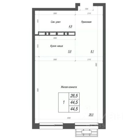 Базовая планировка квартиры - 2 большие комнаты с двумя проходами в каждой. С помощью возведения перегородки можно перепланировать квартиру под нужды любой семьи.