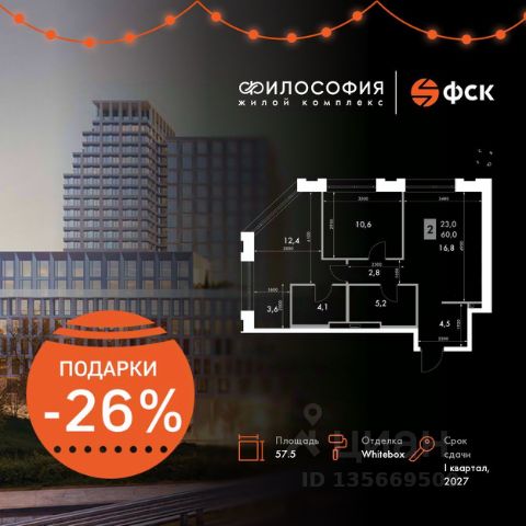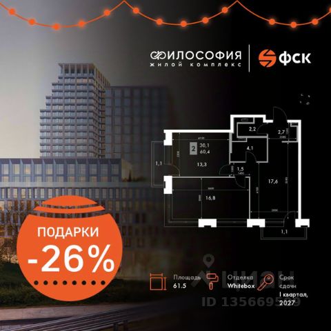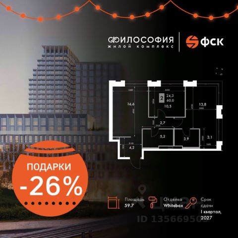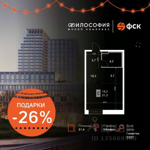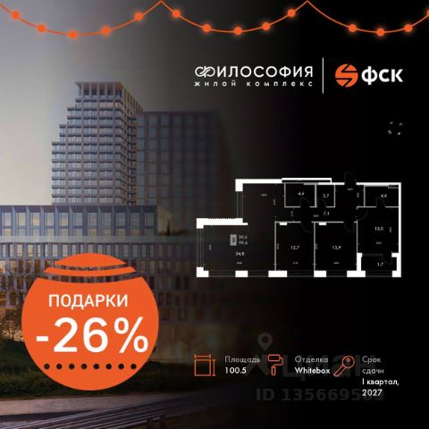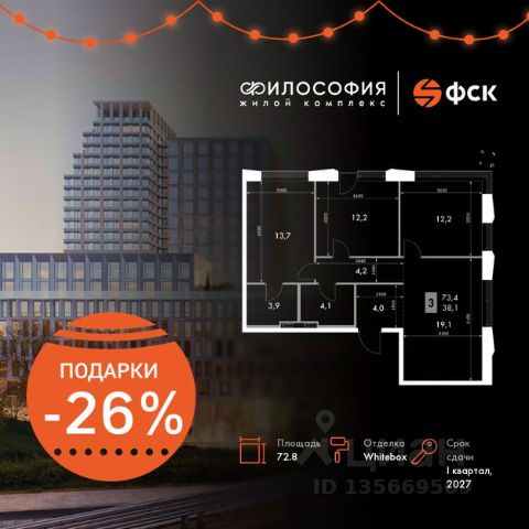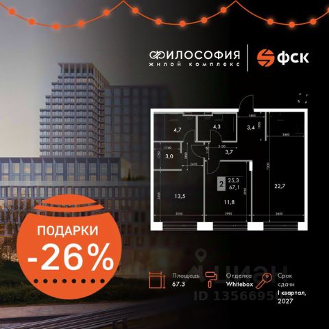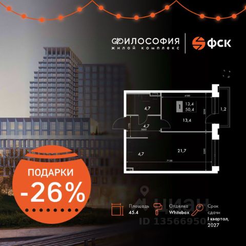 Прямая продажа от застройщика! Жилой Комплекс бизнес-класса. Продаётся 2-к квартира номер 243 общей площадью 45.4 кв.м. на 4-м этаже 23 этажного здания. Отделка Whitebox. Цена с учётом скидки. Особенности квартиры: - Линейная планировка - максимальная функциональность и удобство. - Евроформат - просторное и удобное жилье с отличной планировкой. - Кухня-гостиная - идеальное пространство для встреч с близкими. - Балкон - открытое пространство для отдыха. Квартира с предчистовой отделкой (White box). Вам не придется заниматься черновыми и трудоёмкими работы, а чистовую отделку и дизайн - сделайте на свой вкус. Информация о комплексе: В самом центре Владивостока рождается "Философия" - жилой комплекс бизнес-класса, вдохновлённый идеей гармонии. Семь тематических зданий складываются в единое произведение архитектуры, где каждая деталь продумана для вашего комфорта, вдохновения и покоя. Транспортная доступность: - 15 мин. пешком до Пушкинского театра и музейно-театрального центра на Орлиной сопке - 15 мин. пешком до Набережной Цесаревича - 5-10 мин. на машине до парка Минного городка - Продам квартиру в микрорайоне Некрасовская в городе Владивосток.