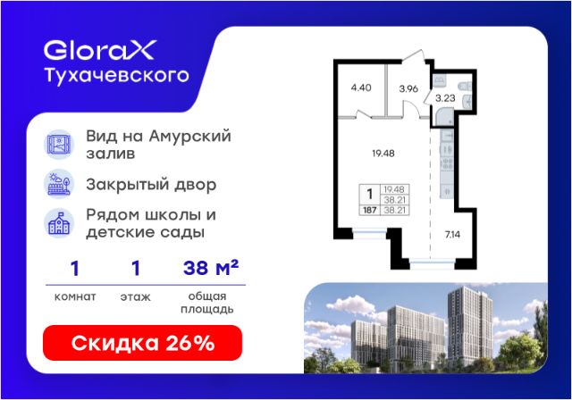 Продается квартира-студия на 1-м этаже в жилом комплексе GloraX Тухачевского — современном проекте нового формата в престижном районе Владивостока. Общая площадь лота составляет 29,47 кв. м, из которых 13,56 кв. м отведено под жилую и 5,13 кв. м под кухонную зону. Номер квартиры - 5. Преимущества квартиры: студия. Преимущества проекта: • Панорамный вид на Амурский залив и зелёные сопки • Удачное расположение и транспортная доступность: Первореченский район, 20 минут до центра города • Закрытая охраняемая территория с доступом только для жителей • Эксклюзивное благоустройство: продуманное зонирование, игровые и спортивные площадки, арт-инсталляция, Тайный сад • Безбарьерная среда, видеонаблюдений, Wi-Fi на территории • Премиальный дизайн входных групп реcепшн и лаунж-зоной • Лапомойки, колясочные и туалеты на первом этаже • Подземный паркинг на 449 машиномест с доступом на лифте с жилых этажей • Индивидуальные кладовые на цокольном этаже от 2 до 10 м2 GloraX Тухачевского — это городское пространство нового формата, которое позволяет современным горожанам находить все необходимые атрибуты комфортной жизни внутри своего жилого комплекса. Весь комплекс спроектирован так, чтобы жить здесь было удобно и безопасно: светлые лаунж-зоны и ресепшн на входах в жилые корпуса, эксклюзивный дизайн мест общего пользования и придомовой территории, круглосуточная охрана, видеонаблюдение и даже детский сад в одном из корпусов все, что необходимо современному городскому жителю. GloraX Тухачевского находится в одном из самых престижных районов города с хорошей, давно сформировавшейся инфраструктурой и отличной транспортной доступностью. Отсюда легко добраться до центра города, других районов и даже пригорода как на собственном транспорте, так и на общественном. Квартал имеет прямой выезд на ул. Тухачевского, а рядом с комплексом расположена автобусная остановка на несколько маршрутов. Проект состоит из 3 монолитных корпусов, объединенных единым стилобатом. В комплексе предусмотрены: подземный паркинг с лифтом на жилые этажи, кладовые для хранения, благоустроенный двор без машин, детские и спортивные площадки, зоны для отдыха и прогулок. Эксклюзивный проект благоустройства территории разработан одной из лучших студий ландшафтного дизайна DEREVOPARK с фокусом на комфорт и удобство для всех жителей комплекса. Вся необходимая инфраструктура — магазины, школы, детские сады, остановки общественного транспорта — находится рядом. Узнайте подробности и подберите свою квартиру в GloraX Тухачевского — в отделе продаж уже сегодня. Цена указана при 100% оплате или стандартной ипотеке. Узнайте подробности в Отделе продаж.