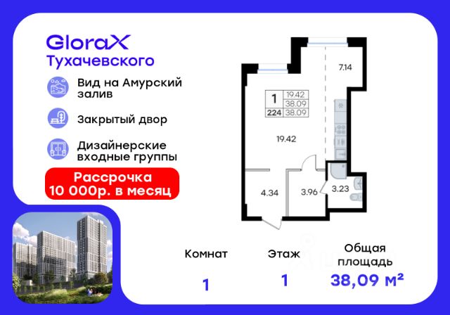 Продается квартира-студия на 1-м этаже в жилом комплексе GloraX Тухачевского — современном проекте нового формата в престижном районе Владивостока. Общая площадь лота составляет 29,47 кв. м, из которых 13,56 кв. м отведено под жилую и 5,13 кв. м под кухонную зону. Номер квартиры - 5. Преимущества квартиры: студия. Преимущества проекта: • Панорамный вид на Амурский залив и зелёные сопки • Удачное расположение и транспортная доступность: Первореченский район, 20 минут до центра города • Закрытая охраняемая территория с доступом только для жителей • Эксклюзивное благоустройство: продуманное зонирование, игровые и спортивные площадки, арт-инсталляция, Тайный сад • Безбарьерная среда, видеонаблюдений, Wi-Fi на территории • Премиальный дизайн входных групп реcепшн и лаунж-зоной • Лапомойки, колясочные и туалеты на первом этаже • Подземный паркинг на 449 машиномест с доступом на лифте с жилых этажей • Индивидуальные кладовые на цокольном этаже от 2 до 10 м2 GloraX Тухачевского — это городское пространство нового формата, которое позволяет современным горожанам находить все необходимые атрибуты комфортной жизни внутри своего жилого комплекса. Весь комплекс спроектирован так, чтобы жить здесь было удобно и безопасно: светлые лаунж-зоны и ресепшн на входах в жилые корпуса, эксклюзивный дизайн мест общего пользования и придомовой территории, круглосуточная охрана, видеонаблюдение и даже детский сад в одном из корпусов все, что необходимо современному городскому жителю. GloraX Тухачевского находится в одном из самых престижных районов города с хорошей, давно сформировавшейся инфраструктурой и отличной транспортной доступностью. Отсюда легко добраться до центра города, других районов и даже пригорода как на собственном транспорте, так и на общественном. Квартал имеет прямой выезд на ул. Тухачевского, а рядом с комплексом расположена автобусная остановка на несколько маршрутов. Проект состоит из 3 монолитных корпусов, объединенных единым стилобатом. В комплексе предусмотрены: подземный паркинг с лифтом на жилые этажи, кладовые для хранения, благоустроенный двор без машин, детские и спортивные площадки, зоны для отдыха и прогулок. Эксклюзивный проект благоустройства территории разработан одной из лучших студий ландшафтного дизайна DEREVOPARK с фокусом на комфорт и удобство для всех жителей комплекса. Вся необходимая инфраструктура — магазины, школы, детские сады, остановки общественного транспорта — находится рядом. Узнайте подробности и подберите свою квартиру в GloraX Тухачевского — в отделе продаж уже сегодня. Цена указана при 100% оплате или стандартной ипотеке. Узнайте подробности в Отделе продаж.