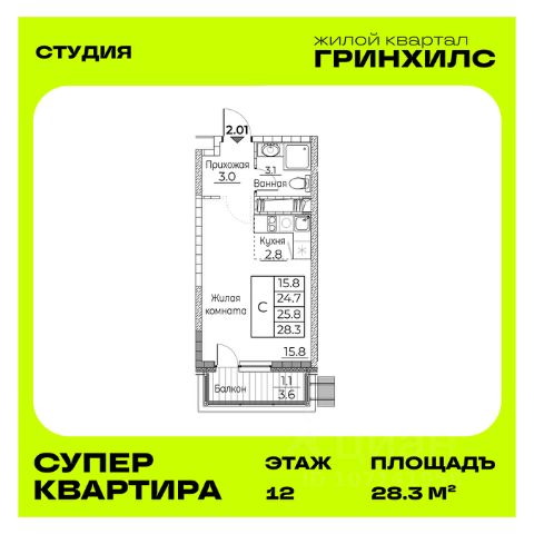 Продается студия с отделкой под ключ в ЖК "Гринхилс". Общая площадь квартиры — 28.3 кв. м, этаж 12 из 23. Тип дома — монолитный. Цена указана при 100% оплате. ЖК "Гринхилс" — жилой квартал комфорт-класса в выгодной локации микрорайона Зеленый угол: развивающегося современного жилого кластера во Владивостоке, внутри которого реализуются проекты нового поколения, преобразуя город. Полный набор необходимой инфраструктуры, транспортная доступность, исторические места города в шаговой доступности, а также окружение леса — все это и есть современный Зеленый угол. ТРАНСПОРНАЯ ДОСТУПНОСТЬ - 15 минут до центра; - 17 минут до ж/д вокзала; - 10 мин до пляжа Патрокл*; - 30 минут до автовокзала; - 50 минут до аэропорта. *В конце 2025 года планируется ввод дороги, соединяющей район с объездной Седанка-ДеФриз-Патрокл. ПЛАНОВЫЙ ВВОД В ЭКСПЛУАТАЦИЮ - 1 корпуса — 2 квартал 2026 года; - 2 и 3 корпусов — 2 квартал 2027 года. АРХИТЕКРУРНЫЕ И ИНЖЕНЕРНЫЕ РЕШЕНИЯ, ПОВЫШАЮЩИЕ КАЧЕСТВО ЖИЗНИ - Приватный безопасный каскадный двор-парк площадью более 4000м2, спроектирован как отдельный архитектурный объект с зонами, включающими в себя целый комплекс оборудования для детей и взрослых, озеленением и современным освещением, благодаря которому будет приятно гулять и отдыхать во дворе в вечернее и ночное время; - Доступ на территорию всего ЖК только для вас и ваших гостей; - Видеонаблюдение по периметру всего ЖК, безбарьерный доступ в дом с обеих сторон и современная домофония; - Дизайнерская отделка мест общего пользования, чтобы было приятно каждый раз, когда приходишь к себе домой; - Предусмотрено место для консьержа, а также туалеты на первых этажах для вашего комфорта; - Колясочные и три современных лифта c прямым доступом к индивидуальным кладовым и паркингу; - Трехэтажный приватный паркинг в 3-м корпусе: широкие проезды, индивидуальные машиноместа, безопасное и комфортное хранение вашего автопарка. МНОЖЕСТВО ПЛАНИРОВОЧНЫХ РЕШЕНИЙ И ВАРИАНТОВ ОТДЕЛКИ - Студии, 1к, 2к, 3к, 4к и квартиры евро-формата спроектированных по стандарту "Эргом2етрика", учитывающие различные сценарии жизни. Для вашего удобства для каждого варианта планировки вы можете выбрать подходящую готовности квартиры: - Без отделки; - Без отделки с выполненной стяжкой пола; - Whitebox — квартира, готовая к декорированию: стены подготовлены дя отделки, проведена электрика с учетом рекомендаций по расстановке мебели и бытовой техники, выровнен пол, в каждой квартире установлена взломостойкая входная дверь; - Whitebox plus — квартира, готовая к декорированию, в которой выполнена полностью отделка санузла; - Квартира с полностью готовой современной отделкой в светлых тонах. Во всех квартирах лоджии имеют панорамное остекление. Для вашего удобства в 1м корпусе открыт демонстрационный этаж, где вы сможете вживую увидеть все варианты отделок квартир. Записывайтесь на показ по контактам в этом объявлении.