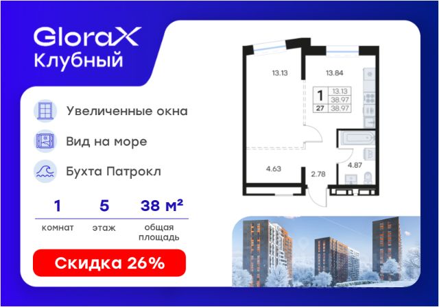 Продается квартира-студия на 13-м этаже в квартале GloraX Клубный. GloraX Клубный - уникальный видовой проект с выделяющейся архитектурой в развитом районе Владивостока. Общая площадь лота составляет 21,87 кв. м, из которых 8,98 кв. м отведено под жилую и 2,25 кв. м под кухонную зону. Номер квартиры - 136. Преимущества квартиры: студия; вид на море; высокий этаж. Преимущества проекта: • Квартиры с панорамными видами на бухту Патрокл, маяк Басаргина и остров Русский • Планировочные решения под любой жизненный сценарий от 23 до 67 м² • Гардеробные комнаты, увеличенные панорамные окна, просторные кухни-гостиные • Эксклюзивное благоустройство: продуманное зонирование, игровые и спортивные площадки, площадка для стритбола, амфитеатр • Премиальный дизайн входных групп с лаунж-зоной • Безбарьерная среда, закрытая территория, видеонаблюдение • Лапомойки, колясочные и туалеты на первом этаже • Двухуровневый подземный паркинг на 350 машино-мест с лифтом на жилые этажи • Келлеры на цокольном этаже для хранения сезонных вещей с доступом на лифте • Современный ландшафтный дизайн комплекса от DEREVOPARK GloraX Клубный заповедник в черте мегаполиса. Комплекс тщательно продуман для максимального удобства и обеспечения безопасности его жителей. Квартал расположен в одном из самых современных развивающихся районов города: совсем рядом раскинулась живописная бухта Патрокл, где можно прогуляться по облагороженной пешеходной набережной, заглянуть на пляж или в школу серфинга. Комплекс имеет прекрасную транспортную доступность: рядом проходит объездная трасса СеданкаПатрокл, а до центар можно доехать всего за 15 минут. Проект включает 3 монолитных корпуса, каждый из которых спроектирован с акцентом на комфорт, безопасность и современный образ жизни рядом с уникальной природой. Общий двор создает приватную территорию для житей комплекса. В комплексе предусмотрен двухуровневый подземный паркинг на 350 машино-мест с доступом прямо с жилых этажей. Паркинг оборудован современными системами видеонаблюдения, контроля въезда-выезда и пожаротушения. На цокольном этаже размещаются келлеры для хранения сезонных и габаритных вещей. Доступ к кладовым на лифте с жилых этажей. Современный ландшафтный дизайн жилого комплекса GloraX Клубный создан ведущей российской студией DEREVOPARK. Во дворе для детей всех возрастов предусмотрены различные игровые площадки с лазалками, батутами, качелями и песочницей. В центре расположен специальный "зеленый остров", где взрослые могут отдохнуть на качелях и гамаках в тени больших деревьев. Для любителей спорта предусмотрены две специальные спортивные площадки для настольного тенниса и стритбола — для зрителей тоже найдется место! А еще на территории комплекса будет дорожка для роллеров и любителей покататься на велосипеде, самокате или скейте. В шаговой доступности располагаются все необходимые объекты социальной и коммерческой инфраструктуры. Цена указана при 100% опла
