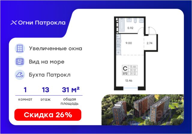 Продается квартира-студия на 13-м этаже в проекте Огни Патрокла от GloraX. Огни Патрокла - уникальный видовой проект с выделяющейся архитектурой в развитом районе Владивостока. Общая площадь лота составляет 21,87 кв. м, из которых 8,98 кв. м отведено под жилую и 2,25 кв. м под кухонную зону. Номер квартиры - 136. Преимущества квартиры: студия; вид на море; высокий этаж. Преимущества проекта: • Квартиры с панорамными видами на бухту Патрокл, маяк Басаргина и остров Русский • Планировочные решения под любой жизненный сценарий от 23 до 67 м² • Гардеробные комнаты, увеличенные панорамные окна, просторные кухни-гостиные • Эксклюзивное благоустройство: продуманное зонирование, игровые и спортивные площадки, площадка для стритбола, амфитеатр • Премиальный дизайн входных групп с лаунж-зоной • Безбарьерная среда, закрытая территория, видеонаблюдение • Лапомойки, колясочные и туалеты на первом этаже • Двухуровневый подземный паркинг на 350 машино-мест с лифтом на жилые этажи • Келлеры на цокольном этаже для хранения сезонных вещей с доступом на лифте • Современный ландшафтный дизайн комплекса от DEREVOPARK Проект Огни Патрокла заповедник в черте мегаполиса. Комплекс тщательно продуман для максимального удобства и обеспечения безопасности его жителей. Квартал расположен в одном из самых современных развивающихся районов города: совсем рядом раскинулась живописная бухта Патрокл, где можно прогуляться по облагороженной пешеходной набережной, заглянуть на пляж или в школу серфинга. Комплекс имеет прекрасную транспортную доступность: рядом проходит объездная трасса СеданкаПатрокл, а до центра можно доехать всего за 15 минут. Проект включает 3 монолитных корпуса, каждый из которых спроектирован с акцентом на комфорт, безопасность и современный образ жизни рядом с уникальной природой. Общий двор создает приватную территорию для жителей комплекса. В комплексе предусмотрен двухуровневый подземный паркинг на 350 машино-мест с доступом прямо с жилых этажей. Паркинг оборудован современными системами видеонаблюдения, контроля въезда-выезда и пожаротушения. На цокольном этаже размещаются келлеры для хранения сезонных и габаритных вещей. Доступ к кладовым на лифте с жилых этажей. Современный ландшафтный дизайн жилого комплекса Огни Патрокла создан ведущей российской студией DEREVOPARK. Во дворе для детей всех возрастов предусмотрены различные игровые площадки с лазалками, батутами, качелями и песочницей. В центре расположен специальный "зеленый остров", где взрослые могут отдохнуть на качелях и гамаках в тени больших деревьев. Для любителей спорта предусмотрены две специальные спортивные площадки для настольного тенниса и стритбола — для зрителей тоже найдется место! А еще на территории комплекса будет дорожка для роллеров и любителей покататься на велосипеде, самокате или скейте. В шаговой доступности располагаются все необходимые объекты социальной и коммерческой инфраструктуры. Действуют ск