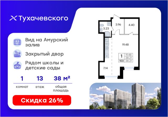 Продаётся квартира-студия площадью 20 кв.м на 13 этаже 25 этажного дома (Корпус 3, Секция 1) проекта ПИК Снежный парк. Светлый просторный подъезд на уровне земли, функциональная планировка, большие окна, предчистовая отделка. Жилой квартал "Снежный парк" возводится в развитом микрорайоне Владивостока - Снеговой Пади. Рядом уже есть всё для комфортной жизни: 2 школы, детская и взрослая поликлиники, торговый центр и магазины. Проект будет состоять из 7 корпусов, высота которых от 24 до 29 этажей. Благодаря низкой плотности застройки жители будут чувствовать себя комфортно. За счёт переменной этажности в квартиры будет попадать ещё больше естественного света. Из окон последних этажей будет открываться панорамный вид на Амурский залив и лес. В квартирах предусмотрены большие окна, застеклённые балконы и лоджии - будет светло и уютно даже зимой. В жилом квартале появится уникальное общественное пространство с пешеходным бульваром и зонами для отдыха. На первых этажах откроются кафе, магазины и полезные сервисы, куда можно спуститься за горячим кофе или свежеиспечённым хлебом. Из каждого дома будет выход в уютный двор-парк с современными детскими и спортивными площадками. Здесь мы посадим цветы и деревья: будет приятно отдыхать или почитать книгу. Артикул 785790 (Застройщик ООО "СЗ ФОРМУЛА-ДВ")