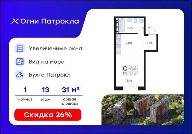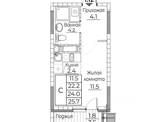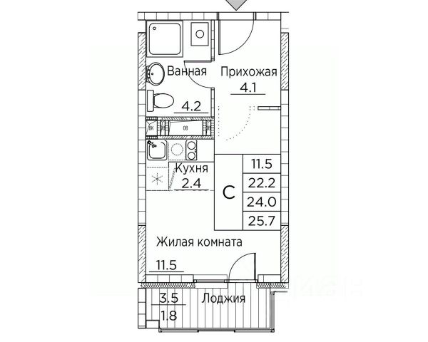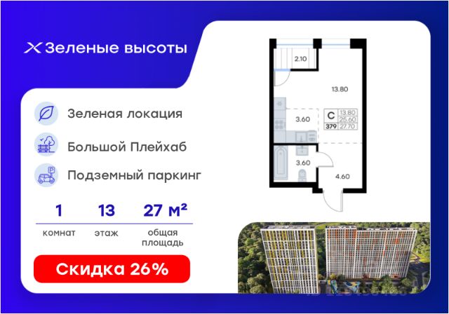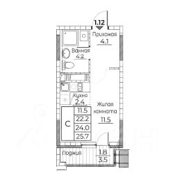 Общая площадь квартиры — 25.7 кв. м, этаж 13 из 20.