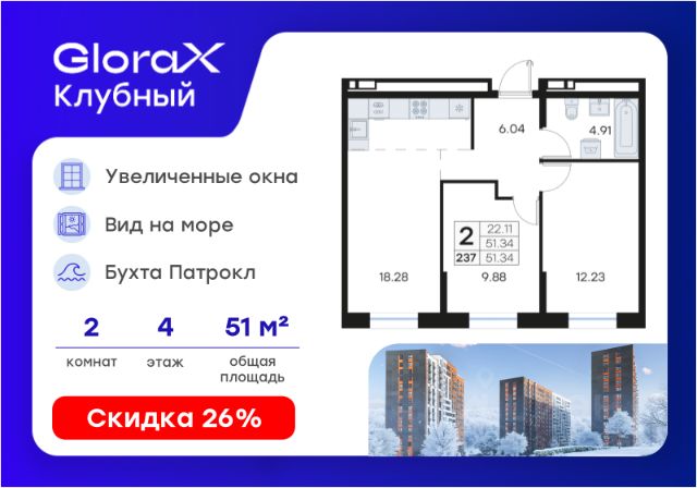 Продается квартира-студия на 4-м этаже в квартале GloraX Клубный. GloraX Клубный - уникальный видовой проект с выделяющейся архитектурой в развитом районе Владивостока. Общая площадь лота составляет 31,12 кв. м, из которых 18,21 кв. м отведено под жилую и 4,25 кв. м под кухонную зону. Номер квартиры - 42. Преимущества квартиры: студия; вид на море. Преимущества проекта: • Квартиры с панорамными видами на бухту Патрокл, маяк Басаргина и остров Русский • Планировочные решения под любой жизненный сценарий от 23 до 67 м² • Гардеробные комнаты, увеличенные панорамные окна, просторные кухни-гостиные • Эксклюзивное благоустройство: продуманное зонирование, игровые и спортивные площадки, площадка для стритбола, амфитеатр • Премиальный дизайн входных групп с лаунж-зоной • Безбарьерная среда, закрытая территория, видеонаблюдение • Лапомойки, колясочные и туалеты на первом этаже • Двухуровневый подземный паркинг на 350 машино-мест с лифтом на жилые этажи • Келлеры на цокольном этаже для хранения сезонных вещей с доступом на лифте • Современный ландшафтный дизайн комплекса от DEREVOPARK GloraX Клубный заповедник в черте мегаполиса. Комплекс тщательно продуман для максимального удобства и обеспечения безопасности его жителей. Квартал расположен в одном из самых современных развивающихся районов города: совсем рядом раскинулась живописная бухта Патрокл, где можно прогуляться по облагороженной пешеходной набережной, заглянуть на пляж или в школу серфинга. Комплекс имеет прекрасную транспортную доступность: рядом проходит объездная трасса СеданкаПатрокл, а до центар можно доехать всего за 15 минут. Проект включает 3 монолитных корпуса, каждый из которых спроектирован с акцентом на комфорт, безопасность и современный образ жизни рядом с уникальной природой. Общий двор создает приватную территорию для житей комплекса. В комплексе предусмотрен двухуровневый подземный паркинг на 350 машино-мест с доступом прямо с жилых этажей. Паркинг оборудован современными системами видеонаблюдения, контроля въезда-выезда и пожаротушения. На цокольном этаже размещаются келлеры для хранения сезонных и габаритных вещей. Доступ к кладовым на лифте с жилых этажей. Современный ландшафтный дизайн жилого комплекса GloraX Клубный создан ведущей российской студией DEREVOPARK. Во дворе для детей всех возрастов предусмотрены различные игровые площадки с лазалками, батутами, качелями и песочницей. В центре расположен специальный "зеленый остров", где взрослые могут отдохнуть на качелях и гамаках в тени больших деревьев. Для любителей спорта предусмотрены две специальные спортивные площадки для настольного тенниса и стритбола — для зрителей тоже найдется место! А еще на территории комплекса будет дорожка для роллеров и любителей покататься на велосипеде, самокате или скейте. В шаговой доступности располагаются все необходимые объекты социальной и коммерческой инфраструктуры. Действуют скидки при определенных условия