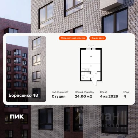 Продаётся квартира-студия площадью 24 кв.м на 4 этаже 28 этажного дома (Корпус 2, Секция 2) проекта ПИК Борисенко 48. Светлый просторный подъезд на уровне земли, функциональная планировка, большие окна, предчистовая отделка. "Борисенко 48" - небольшой квартал в Первомайском районе, в 15 минутах пути на автомобиле от центра Владивостока. С верхних этажей откроется живописный вид на город и сопки. В проекте всего четыре дома и подземный паркинг, в который можно будет спуститься на лифте. Высота домов от 17 до 30 этажей - благодаря переменной этажности солнце будет лучше освещать двор и квартиры. На первых этажах откроются пекарни, кафе, магазины и другие сервисы - это удобно, когда внезапно закончится хлеб или захочется побаловать себя горячим кофе. Из каждого дома будет выход в уютный двор-парк - это закрытая территория для отдыха, где растут цветы и деревья, оборудованы детские и спортивные площадки. Рядом с "Борисенко 48" появится также детский сад для 150 малышей. В пешей доступности есть всё необходимое для комфортной жизни: школы, детские сады, поликлиника и магазины. До крупных торговых центров "Калина Молл" и "Луговая", а также супермаркета "Реми" - всего 5 минут на машине. А до озера на Сафонова, которое отлично подходит для прогулок и отдыха, можно дойти пешком за 9 минут. Живописная Леопардовая набережная - в 10 минутах на автомобиле. Из квартала можно будет выехать как на улицу Борисенко, так и на улицу Сафонова. Артикул 918307 (Застройщик ООО "СЗ "Юстина")