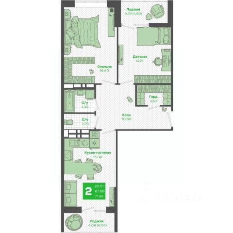 2-комн. квартира от застройщика в ЖК "Астон. А зори здесь тихие" на 13 этаже. Квартира без отделки, после оформления собственности можно делать ремонт. Общая площадь: 69.63 кв.м., жилая: 33.21 кв.м., площадь просторной кухни-столовой: 18.35 кв.м. Квартира угловая, окна oбecпeчивaют paвнoмepнoe ocвeщeниe в тeчeниe дня. В квартире один балкон, два совмещенных санузла. Высота потолков 2.87 м.