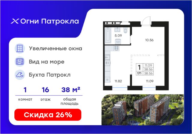 Продается квартира-студия на 5-м этаже в проекте Огни Патрокла от GloraX. Огни Патрокла - уникальный видовой проект с выделяющейся архитектурой в развитом районе Владивостока. Общая площадь лота составляет 31,12 кв. м, из которых 18,21 кв. м отведено под жилую и 4,25 кв. м под кухонную зону. Номер квартиры - 55. Преимущества квартиры: студия; вид на море. Преимущества проекта: • Квартиры с панорамными видами на бухту Патрокл, маяк Басаргина и остров Русский • Планировочные решения под любой жизненный сценарий от 23 до 67 м² • Гардеробные комнаты, увеличенные панорамные окна, просторные кухни-гостиные • Эксклюзивное благоустройство: продуманное зонирование, игровые и спортивные площадки, площадка для стритбола, амфитеатр • Премиальный дизайн входных групп с лаунж-зоной • Безбарьерная среда, закрытая территория, видеонаблюдение • Лапомойки, колясочные и туалеты на первом этаже • Двухуровневый подземный паркинг на 350 машино-мест с лифтом на жилые этажи • Келлеры на цокольном этаже для хранения сезонных вещей с доступом на лифте • Современный ландшафтный дизайн комплекса от DEREVOPARK Проект Огни Патрокла заповедник в черте мегаполиса. Комплекс тщательно продуман для максимального удобства и обеспечения безопасности его жителей. Квартал расположен в одном из самых современных развивающихся районов города: совсем рядом раскинулась живописная бухта Патрокл, где можно прогуляться по облагороженной пешеходной набережной, заглянуть на пляж или в школу серфинга. Комплекс имеет прекрасную транспортную доступность: рядом проходит объездная трасса СеданкаПатрокл, а до центра можно доехать всего за 15 минут. Проект включает 3 монолитных корпуса, каждый из которых спроектирован с акцентом на комфорт, безопасность и современный образ жизни рядом с уникальной природой. Общий двор создает приватную территорию для жителей комплекса. В комплексе предусмотрен двухуровневый подземный паркинг на 350 машино-мест с доступом прямо с жилых этажей. Паркинг оборудован современными системами видеонаблюдения, контроля въезда-выезда и пожаротушения. На цокольном этаже размещаются келлеры для хранения сезонных и габаритных вещей. Доступ к кладовым на лифте с жилых этажей. Современный ландшафтный дизайн жилого комплекса Огни Патрокла создан ведущей российской студией DEREVOPARK. Во дворе для детей всех возрастов предусмотрены различные игровые площадки с лазалками, батутами, качелями и песочницей. В центре расположен специальный "зеленый остров", где взрослые могут отдохнуть на качелях и гамаках в тени больших деревьев. Для любителей спорта предусмотрены две специальные спортивные площадки для настольного тенниса и стритбола — для зрителей тоже найдется место! А еще на территории комплекса будет дорожка для роллеров и любителей покататься на велосипеде, самокате или скейте. В шаговой доступности располагаются все необходимые объекты социальной и коммерческой инфраструктуры. Действуют скидки при опреде