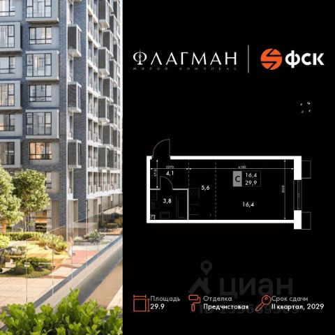 Квартиры от застройщика! Современный жилой комплекс комфорт-класса в развитом районе города. Продаётся квартира-студия номер 42 общей площадью 29.9 кв.м. на 5-м этаже 30 этажного здания. Предчистовая отделка. Цена с учётом скидки. Особенности квартиры: - Линейная планировка - максимальная функциональность и удобство. Квартира с предчистовой отделкой. Вам не придется заниматься черновыми и трудоёмкими работы, а чистовую отделку и дизайн - сделайте на свой вкус. Информация о комплексе: Жилой комплекс "Флагман" - это сочетание продуманной архитектуры, качественных материалов и развитой инфраструктуры. Проект реализован в едином архитектурном стиле: современные фасады, аккуратные линии и внимание к деталям формируют выразительный облик района. Закрытые дворы, озеленение и приватные пространства создают ощущение уюта и защищенности в городской среде. Комплекс расположен в районе с уже сложившейся социальной и коммерческой инфраструктурой, что делает его удобным для жизни без необходимости долгих поездок. Транспортная доступность: - 9 мин. пешком до детского сада - 7 мин. до школы - 5 мин. до взрослой поликлиники - 1 мин. до автобусной остановки Внутренняя инфраструктура: Территория проекта спроектирована с учетом повседневных сценариев жизни. Закрытые дворы оборудованы современными детскими и спортивными площадками. В домах предусмотрены колясочные и кладовые помещения. Входные группы выполнены на уровне земли без ступеней и пандусов, что обеспечивает комфорт для семей с детьми, пожилых людей и маломобильных жителей. Для автомобилистов предусмотрен одноэтажный паркинг с автоматической мойкой. На первых этажах домов размещены коммерческие помещения с магазинами и сервисами первой необходимости, формирующие удобную среду прямо у дома.