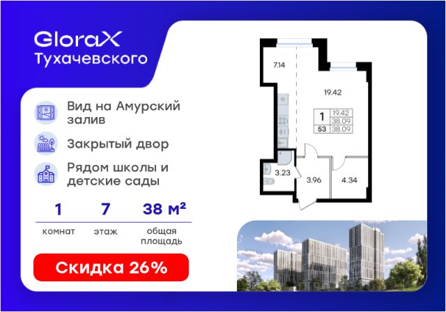 Продается квартира-студия на 7-м этаже в жилом комплексе GloraX Тухачевского — современном проекте нового формата в престижном районе Владивостока. Общая площадь лота составляет 27,06 кв. м, из которых 12,09 кв. м отведено под жилую и 5,13 кв. м под кухонную зону. Номер квартиры - 59. Преимущества квартиры: студия. Преимущества проекта: • Панорамный вид на Амурский залив и зелёные сопки • Удачное расположение и транспортная доступность: Первореченский район, 20 минут до центра города • Закрытая охраняемая территория с доступом только для жителей • Эксклюзивное благоустройство: продуманное зонирование, игровые и спортивные площадки, арт-инсталляция, Тайный сад • Безбарьерная среда, видеонаблюдений, Wi-Fi на территории • Премиальный дизайн входных групп реcепшн и лаунж-зоной • Лапомойки, колясочные и туалеты на первом этаже • Подземный паркинг на 449 машиномест с доступом на лифте с жилых этажей • Индивидуальные кладовые на цокольном этаже от 2 до 10 м2 GloraX Тухачевского — это городское пространство нового формата, которое позволяет современным горожанам находить все необходимые атрибуты комфортной жизни внутри своего жилого комплекса. Весь комплекс спроектирован так, чтобы жить здесь было удобно и безопасно: светлые лаунж-зоны и ресепшн на входах в жилые корпуса, эксклюзивный дизайн мест общего пользования и придомовой территории, круглосуточная охрана, видеонаблюдение и даже детский сад в одном из корпусов все, что необходимо современному городскому жителю. GloraX Тухачевского находится в одном из самых престижных районов города с хорошей, давно сформировавшейся инфраструктурой и отличной транспортной доступностью. Отсюда легко добраться до центра города, других районов и даже пригорода как на собственном транспорте, так и на общественном. Квартал имеет прямой выезд на ул. Тухачевского, а рядом с комплексом расположена автобусная остановка на несколько маршрутов. Проект состоит из 3 монолитных корпусов, объединенных единым стилобатом. В комплексе предусмотрены: подземный паркинг с лифтом на жилые этажи, кладовые для хранения, благоустроенный двор без машин, детские и спортивные площадки, зоны для отдыха и прогулок. Эксклюзивный проект благоустройства территории разработан одной из лучших студий ландшафтного дизайна DEREVOPARK с фокусом на комфорт и удобство для всех жителей комплекса. Вся необходимая инфраструктура — магазины, школы, детские сады, остановки общественного транспорта — находится рядом. Узнайте подробности и подберите свою квартиру в GloraX Тухачевского — в отделе продаж уже сегодня. Цена указана при 100% оплате или стандартной ипотеке. Узнайте подробности в Отделе продаж.
