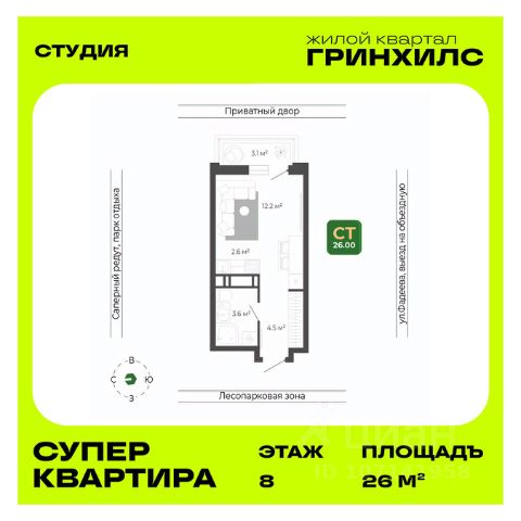 Продается студия с отделкой под ключ в ЖК "Гринхилс". Общая площадь квартиры — 26.2 кв. м, этаж 8 из 22. Тип дома — монолитный. Цена указана при 100% оплате. ЖК "Гринхилс" — жилой квартал комфорт-класса в выгодной локации микрорайона Зеленый угол: развивающегося современного жилого кластера во Владивостоке, внутри которого реализуются проекты нового поколения, преобразуя город. Полный набор необходимой инфраструктуры, транспортная доступность, исторические места города в шаговой доступности, а также окружение леса — все это и есть современный Зеленый угол. ТРАНСПОРНАЯ ДОСТУПНОСТЬ - 15 минут до центра; - 17 минут до ж/д вокзала; - 10 мин до пляжа Патрокл*; - 30 минут до автовокзала; - 50 минут до аэропорта. *В конце 2025 года планируется ввод дороги, соединяющей район с объездной Седанка-ДеФриз-Патрокл. ПЛАНОВЫЙ ВВОД В ЭКСПЛУАТАЦИЮ - 1 корпуса — 2 квартал 2026 года; - 2 и 3 корпусов — 2 квартал 2027 года. АРХИТЕКРУРНЫЕ И ИНЖЕНЕРНЫЕ РЕШЕНИЯ, ПОВЫШАЮЩИЕ КАЧЕСТВО ЖИЗНИ - Приватный безопасный каскадный двор-парк площадью более 4000м2, спроектирован как отдельный архитектурный объект с зонами, включающими в себя целый комплекс оборудования для детей и взрослых, озеленением и современным освещением, благодаря которому будет приятно гулять и отдыхать во дворе в вечернее и ночное время; - Доступ на территорию всего ЖК только для вас и ваших гостей; - Видеонаблюдение по периметру всего ЖК, безбарьерный доступ в дом с обеих сторон и современная домофония; - Дизайнерская отделка мест общего пользования, чтобы было приятно каждый раз, когда приходишь к себе домой; - Предусмотрено место для консьержа, а также туалеты на первых этажах для вашего комфорта; - Колясочные и три современных лифта c прямым доступом к индивидуальным кладовым и паркингу; - Трехэтажный приватный паркинг в 3-м корпусе: широкие проезды, индивидуальные машиноместа, безопасное и комфортное хранение вашего автопарка. МНОЖЕСТВО ПЛАНИРОВОЧНЫХ РЕШЕНИЙ И ВАРИАНТОВ ОТДЕЛКИ - Студии, 1к, 2к, 3к, 4к и квартиры евро-формата спроектированных по стандарту "Эргом2етрика", учитывающие различные сценарии жизни. Для вашего удобства для каждого варианта планировки вы можете выбрать подходящую готовности квартиры: - Без отделки; - Без отделки с выполненной стяжкой пола; - Whitebox — квартира, готовая к декорированию: стены подготовлены дя отделки, проведена электрика с учетом рекомендаций по расстановке мебели и бытовой техники, выровнен пол, в каждой квартире установлена взломостойкая входная дверь; - Whitebox plus — квартира, готовая к декорированию, в которой выполнена полностью отделка санузла; - Квартира с полностью готовой современной отделкой в светлых тонах. Во всех квартирах лоджии имеют панорамное остекление. Для вашего удобства в 1м корпусе открыт демонстрационный этаж, где вы сможете вживую увидеть все варианты отделок квартир. Записывайтесь на показ по контактам в этом объявлении.