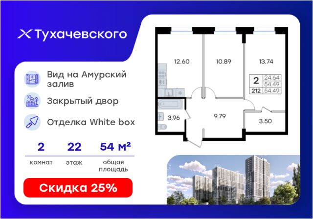 Продается квартира-студия на 8-м этаже в жилом комплексе Тухачевского от GloraX — современном проекте нового формата в престижном районе Владивостока. Общая площадь лота составляет 29,47 кв. м, из которых 13,56 кв. м отведено под жилую и 5,13 кв. м под кухонную зону. Номер квартиры - 246. Преимущества квартиры: студия. Преимущества проекта: • Панорамный вид на Амурский залив и зелёные сопки • Удачное расположение и транспортная доступность: Первореченский район, 20 минут до центра города • Закрытая охраняемая территория с доступом только для жителей • Эксклюзивное благоустройство: продуманное зонирование, игровые и спортивные площадки, арт-инсталляция, Тайный сад • Безбарьерная среда, видеонаблюдений, Wi-Fi на территории • Премиальный дизайн входных групп реcепшн и лаунж-зоной • Лапомойки, колясочные и туалеты на первом этаже • Подземный паркинг на 449 машиномест с доступом на лифте с жилых этажей • Индивидуальные кладовые на цокольном этаже от 2 до 10 м2 Проект Тухачевского — это городское пространство нового формата, которое позволяет современным горожанам находить все необходимые атрибуты комфортной жизни внутри своего жилого комплекса. Весь комплекс спроектирован так, чтобы жить здесь было удобно и безопасно: светлые лаунж-зоны и ресепшн на входах в жилые корпуса, эксклюзивный дизайн мест общего пользования и придомовой территории, круглосуточная охрана, видеонаблюдение и даже детский сад в одном из корпусов все, что необходимо современному городскому жителю. Тухачевского находится в одном из самых престижных районов города с хорошей, давно сформировавшейся инфраструктурой и отличной транспортной доступностью. Отсюда легко добраться до центра города, других районов и даже пригорода как на собственном транспорте, так и на общественном. Квартал имеет прямой выезд на ул. Тухачевского, а рядом с комплексом расположена автобусная остановка на несколько маршрутов. Проект состоит из 3 монолитных корпусов, объединенных единым стилобатом. В комплексе предусмотрены: подземный паркинг с лифтом на жилые этажи, кладовые для хранения, благоустроенный двор без машин, детские и спортивные площадки, зоны для отдыха и прогулок. Эксклюзивный проект благоустройства территории разработан одной из лучших студий ландшафтного дизайна DEREVOPARK с фокусом на комфорт и удобство для всех жителей комплекса. Вся необходимая инфраструктура — магазины, школы, детские сады, остановки общественного транспорта — находится рядом. Узнайте подробности и подберите свою квартиру в Тухачевского от GloraX — в отделе продаж уже сегодня. Действуют скидки при определенных условиях покупки. Узнайте подробности в Отделе продаж.