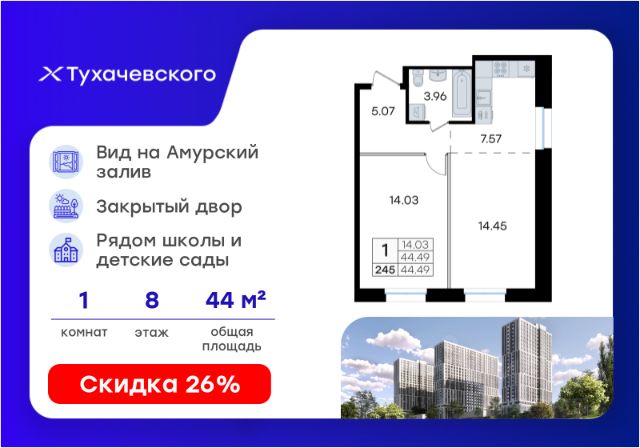 Продается 1-комн. квартира на 8-м этаже в жилом комплексе Тухачевского от GloraX — современном проекте нового формата в престижном районе Владивостока. Общая площадь лота составляет 44,49 кв. м, из которых 14,03 кв. м отведено под жилую и 7,57 кв. м под кухонную зону. Номер квартиры - 245.