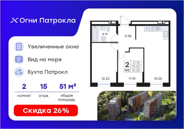 Продаётся квартира-студия площадью 24,1 кв.м на 28 этаже 28 этажного дома (Корпус 2, Секция 2) проекта ПИК Борисенко 48. Светлый просторный подъезд на уровне земли, функциональная планировка, большие окна, предчистовая отделка. "Борисенко 48" - небольшой квартал в Первомайском районе, в 15 минутах пути на автомобиле от центра Владивостока. С верхних этажей откроется живописный вид на город и сопки. В проекте всего четыре дома и подземный паркинг, в который можно будет спуститься на лифте. Высота домов от 17 до 30 этажей - благодаря переменной этажности солнце будет лучше освещать двор и квартиры. На первых этажах откроются пекарни, кафе, магазины и другие сервисы - это удобно, когда внезапно закончится хлеб или захочется побаловать себя горячим кофе. Из каждого дома будет выход в уютный двор-парк - это закрытая территория для отдыха, где растут цветы и деревья, оборудованы детские и спортивные площадки. Рядом с "Борисенко 48" появится также детский сад для 150 малышей. В пешей доступности есть всё необходимое для комфортной жизни: школы, детские сады, поликлиника и магазины. До крупных торговых центров "Калина Молл" и "Луговая", а также супермаркета "Реми" - всего 5 минут на машине. А до озера на Сафонова, которое отлично подходит для прогулок и отдыха, можно дойти пешком за 9 минут. Живописная Леопардовая набережная - в 10 минутах на автомобиле. Из квартала можно будет выехать как на улицу Борисенко, так и на улицу Сафонова. Артикул 918619 (Застройщик ООО "СЗ "Юстина")