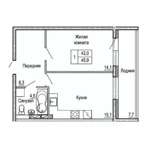 Общая площадь квартиры — 44.6 кв. м, этаж 8 из 19.