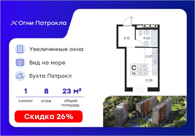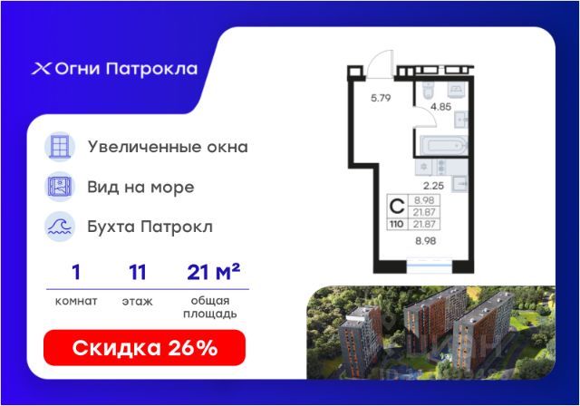 Продаётся квартира-студия площадью 25,3 кв.м на 11 этаже 17 этажного дома (Корпус 5, Секция 1) проекта ПИК Босфорский парк. Светлый просторный подъезд на уровне земли, функциональная планировка, большие окна, предчистовая отделка. Жилой квартал "Босфорский парк" расположен на юге Владивостока, в районе живописной бухты Патрокл. Из окон домов будет открываться прекрасный вид на залив и лес. Дорога до центра Владивостока на автомобиле займёт 20 минут. В "Босфорском парке" появится 20 жилых корпусов с магазинами, кафе и полезными сервисами на первых этажах. На территории проекта предусмотрены два многоуровневых надземных паркинга. В квартале будет много мест для отдыха и активных игр, три вида парков и даже родник, который будет перетекать в ручей с порогами и препятствиями. На территории парков появятся амфитеатры и террасы. Здесь жители смогут отдыхать, гулять, общаться, учиться или работать на свежем воздухе. На естественных склонах будут обустроены игровые зоны для детей - с горками, сетками, канатами и скалолазными зацепами. Всё это - новый формат благоустройства "Многоуровневый ландшафт", который разработан специально для регионов с перепадами высот. Ещё на этапе проектирования архитекторы учли все особенности рельефа, чтобы создать органичное пространство. Артикул 937534 (Застройщик ООО "СПЕЦИАЛИЗИРОВАННЫЙ ЗАСТРОЙЩИК ПИК-ПРИМОРЬЕ") Квартира-студия в новостройке в районе Первомайский в городе Владивосток.