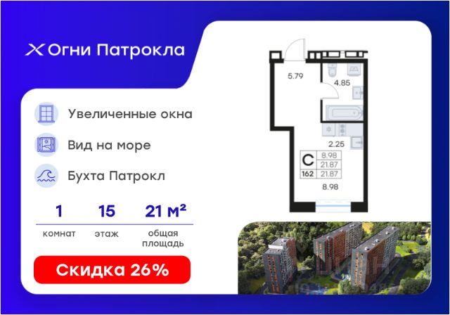 Продаётся квартира-студия площадью 27,3 кв.м на 7 этаже 9 этажного дома (Корпус 10, Секция 1) проекта ПИК Босфорский парк. Светлый просторный подъезд на уровне земли, функциональная планировка, большие окна, предчистовая отделка. Жилой квартал "Босфорский парк" расположен на юге Владивостока, в районе живописной бухты Патрокл. Из окон домов будет открываться прекрасный вид на залив и лес. Дорога до центра Владивостока на автомобиле займёт 20 минут. В "Босфорском парке" появится 20 жилых корпусов с магазинами, кафе и полезными сервисами на первых этажах. На территории проекта предусмотрены два многоуровневых надземных паркинга. В квартале будет много мест для отдыха и активных игр, три вида парков и даже родник, который будет перетекать в ручей с порогами и препятствиями. На территории парков появятся амфитеатры и террасы. Здесь жители смогут отдыхать, гулять, общаться, учиться или работать на свежем воздухе. На естественных склонах будут обустроены игровые зоны для детей - с горками, сетками, канатами и скалолазными зацепами. Всё это - новый формат благоустройства "Многоуровневый ландшафт", который разработан специально для регионов с перепадами высот. Ещё на этапе проектирования архитекторы учли все особенности рельефа, чтобы создать органичное пространство. Артикул 1000974 (Застройщик ООО "СПЕЦИАЛИЗИРОВАННЫЙ ЗАСТРОЙЩИК ПИК-ПРИМОРЬЕ") Квартира-студия в новостройке в районе Первомайский в городе Владивосток.