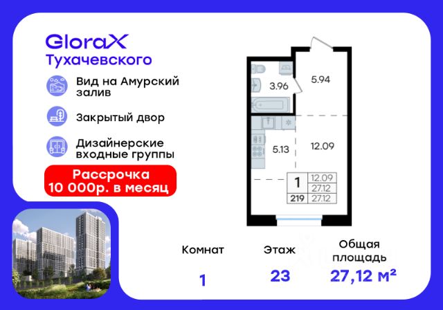 Продается квартира-студия на 21-м этаже в жилом комплексе Видный — современном проекте комфорт-класса в развитом районе Владивостока. Общая площадь лота составляет 32,89 кв. м, из которых 24,62 кв. м отведено под жилую и кв. м под кухонную зону. Номер квартиры - 240. Преимущества проекта: • Дом сдан — ключи можно получить в день оплаты • Современная архитектура и 24 этажа монолитного комфорта • Спокойный район с готовой инфраструктурой и удобной транспортной доступностью • Подземный паркинг на 284 машиноместа с видеонаблюдением и доступом на лифте с жилых этажей • Индивидуальные келлеры от 2,3 до 7,9 м² на подземном уровне • Просторные входные группы с дизайнерской отделкой и помещениями для хранения колясок • Двор без машин: благоустроенная территория, детские и спортивные площадки, зоны отдыха • Коммерческие помещения на первых этажах — магазины, кофейни, пекарни прямо у дома • Авторский ландшафтный проект с освещением, озеленением и зонированием Проект Видный — это городское пространство нового формата, где каждый элемент продуман для комфорта современных жителей. Входы на уровне земли, бесшумные скоростные лифты, дизайнерские холлы, келлеры и колясочные — всё для удобной и современной жизни. Комплекс расположен на улице Карбышева — в тихом, но развитом районе Владивостока. В шаговой доступности — детские сады, школы, магазины, кафе, аптеки и остановки общественного транспорта. Удобный выезд на городские магистрали позволяет быстро добраться до центра, автовокзала (5 км), парка Покровского (8 км) и международного аэропорта (45 км). Архитектура проекта сочетает современные решения и высокое качество материалов. Единственный корпус на 24 этажа выполнен по монолитной технологии с акцентом на эстетику и долговечность фасадов. Пространство организовано с учётом потребностей разных жителей — от молодых семей до деловых людей и пенсионеров. Проект благоустройства разработан с упором на безопасность и комфорт: зоны отдыха, спортивные и игровые площадки, ландшафтный дизайн и вечерняя подсветка создают атмосферу уюта и приватности. Узнайте подробности и подберите свою квартиру в GloraX Видный — в отделе продаж уже сегодня. Цена указана при 100% оплате или стандартной ипотеке. Узнайте подробности в Отделе продаж. Купить квартиру-студию первичка в районе Первореченский в городе Владивосток.