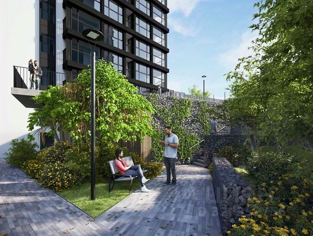 приватное благоустроенное пространство без машин для отдыха на внутренней стилобатной части комплекса с прогулочными зонами, детскими и спортивными площадками, куда могут попасть только жители квартала и их гости;