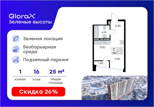 Продается квартира-студия на 16-м этаже в жилом квартале GloraX Зелёные высоты — проекте в тихой зелёной локации. Общая площадь квартиры 25,30 кв. м, из которых 11,50 кв. м включая 11,50 кв. м жилого пространства и 3,00 кв. м кухни. Номер квартиры - 198. Преимущества квартиры: зонируемая студия; вид на лесопарк; лоджия. Преимущества проекта: • Идеальное сочетание городской и загородной жизни • Сдаем в 2026 году • Уютный зелёный район с развитой инфраструктурой • Великолепные виды на Вечнозеленый сквер и лесопарк на 150 Га • Видеонаблюдение, IP-домофон, Wi-Fi на территории, • Дизайнерские входные группы • Безбарьерная среда, колясочные, туалеты на 1 этаже, лапомойки • Эксклюзивное благоустройство территории • Подземный паркинг на 235 машино-мест с лифтом на жилые этажи • Индивидуальные кладовые от 3 до 7 кв. м • Черновая отделка для реализации любых дизайнерских идей GloraX Зелёные высоты — современный жилой проект, сочетающий преимущества городской и пригородной жизни. Комплекс тщательно продуман для максимального удобства и обеспечения безопасности жителей. Квартал расположен в зеленом, живописном и активно развивающемся районе Зеленый Угол, вдали от серой массовой застройки. Жители GloraX Зелёные высоты смогут насладждаться прогулками в Вечнозелёном сквере или лесопарке. В непосредственной близости находятся остановки общественного транспорта и автомобильный подъезд со стороны Нейбута. Скоро также появится выездом на трассу Де-Фриз-Седанка, что обеспечит быстрый доступ в любую часть города и пригород. Проект включает 2 корпуса, каждый из которых спроектирован с акцентом на комфорт, безопасность и современный образ жизни. В комплексе предусмотрен подземный паркинг на 235 машиномест с доступом прямо с жилых этажей. Паркинг оборудован современными системами видеонаблюдения, контроля въезда-выезда и пожаротушения. Цокольный этаж здания отведен под индивидуальные кладовые площадью от 3 до 7 квадратных метров, которые можно использовать для хранения сезонных вещей. Доступ к кладовым - на лифте с жилых этажей. Территория жилого квартала благоустроена и включает игровые зоны и спортивные площадки для детей различных возрастных групп, уютные зоны отдыха со скамейками и универсальную воркаут-площадку для активного досуга. В шаговой доступности располагаются все необходимые объекты социальной инфраструктуры. Узнайте больше в отделе продаж — выберите свою квартиру в GloraX Зелёные высоты уже сегодня! Продается квартира-студия на улице Нейбута в городе Владивосток.
