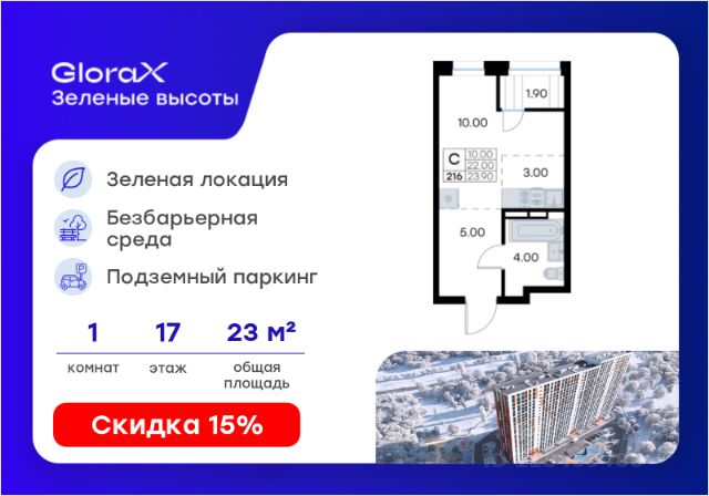 Продается квартира-студия на 7-м этаже в жилом квартале GloraX Зелёные высоты — проекте в тихой зелёной локации. Общая площадь квартиры 27,70 кв. м, из которых 13,80 кв. м включая 13,80 кв. м жилого пространства и 3,60 кв. м кухни. Номер квартиры - 313. Преимущества квартиры: зонируемая студия; лоджия. Преимущества проекта: • Идеальное сочетание городской и загородной жизни • Сдаем в 2026 году • Уютный зелёный район с развитой инфраструктурой • Великолепные виды на Вечнозеленый сквер и лесопарк на 150 Га • Видеонаблюдение, IP-домофон, Wi-Fi на территории, • Дизайнерские входные группы • Безбарьерная среда, колясочные, туалеты на 1 этаже, лапомойки • Эксклюзивное благоустройство территории • Подземный паркинг на 235 машино-мест с лифтом на жилые этажи • Индивидуальные кладовые от 3 до 7 кв. м • Черновая отделка для реализации любых дизайнерских идей GloraX Зелёные высоты — современный жилой проект, сочетающий преимущества городской и пригородной жизни. Комплекс тщательно продуман для максимального удобства и обеспечения безопасности жителей. Квартал расположен в зеленом, живописном и активно развивающемся районе Зеленый Угол, вдали от серой массовой застройки. Жители GloraX Зелёные высоты смогут насладждаться прогулками в Вечнозелёном сквере или лесопарке. В непосредственной близости находятся остановки общественного транспорта и автомобильный подъезд со стороны Нейбута. Скоро также появится выездом на трассу Де-Фриз-Седанка, что обеспечит быстрый доступ в любую часть города и пригород. Проект включает 2 корпуса, каждый из которых спроектирован с акцентом на комфорт, безопасность и современный образ жизни. В комплексе предусмотрен подземный паркинг на 235 машиномест с доступом прямо с жилых этажей. Паркинг оборудован современными системами видеонаблюдения, контроля въезда-выезда и пожаротушения. Цокольный этаж здания отведен под индивидуальные кладовые площадью от 3 до 7 квадратных метров, которые можно использовать для хранения сезонных вещей. Доступ к кладовым - на лифте с жилых этажей. Территория жилого квартала благоустроена и включает игровые зоны и спортивные площадки для детей различных возрастных групп, уютные зоны отдыха со скамейками и универсальную воркаут-площадку для активного досуга. В шаговой доступности располагаются все необходимые объекты социальной инфраструктуры. Узнайте больше в отделе продаж — выберите свою квартиру в GloraX Зелёные высоты уже сегодня!