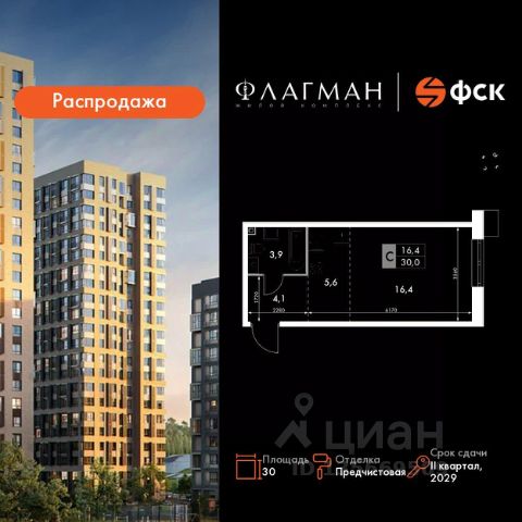 Прямая продажа от застройщика! Жилой Комплекс комфорт-класса. Продаётся квартира-студия номер 55 общей площадью 30 кв.м. на 6-м этаже 30 этажного здания. Отделка Whitebox. Цена с учётом скидки. Особенности квартиры: - Линейная планировка - максимальная функциональность и удобство. Квартира с предчистовой отделкой (White box). Вам не придется заниматься черновыми и трудоёмкими работы, а чистовую отделку и дизайн - сделайте на свой вкус. Информация о комплексе: "Флагман" - современный жилой комплекс для тех, кто ценит комфорт, эстетику и личное пространство. Корпуса, выполненные в едином архитектурном коде, создают выразительный силуэт и формируют гармоничное городское пространство. Современная архитектура от одного из ведущих бюро страны сочетает лаконичность форм и внимание к деталям. Приватные дворы, озеленённые улицы и продуманная инфраструктура делают жизнь здесь по-настоящему комфортной.Благодаря удобному расположению и транспортной доступности, вы легко доберётесь в любую часть города. Транспортная доступность: - 9 мин. пешком до детского сада - 7 мин. до школы - 5 мин. до взрослой поликлиники - 1 мин. до автобусной остановки Внутренняя инфраструктура: Каждая деталь продумана для вашего удобства. Для прогулок и отдыха предусмотрен ландшафтный парк и пешеходный бульвар. Закрытые дворы оснащены детскими и спортивными площадками, а в каждом доме предусмотрены кладовые и колясочные. Комфортные гостевые зоны и зоны ожидания создают атмосферу уюта уже с первых шагов в дом. Все корпуса имеют удобный вход без ступеней и пандусов, обеспечивая лёгкий доступ для жителей любого возраста. Для автомобилистов предусмотрен одноэтажный паркинг с автоматической мойкой, а на первых этажах расположены коммерческие помещения, обеспечивающие повседневные потребности жителей.