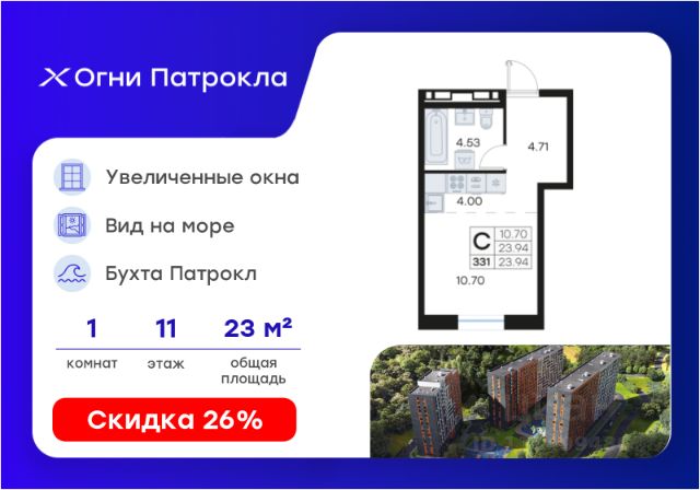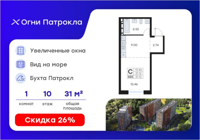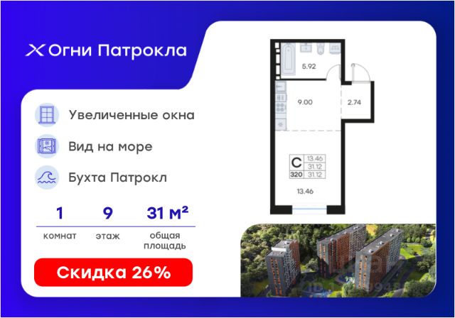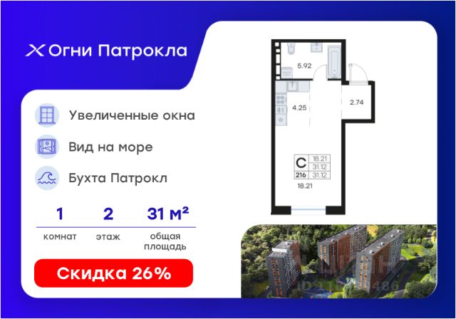 Продается квартира-студия на 8-м этаже в проекте Огни Патрокла от GloraX. Огни Патрокла - уникальный видовой проект с выделяющейся архитектурой в развитом районе Владивостока. Общая площадь лота составляет 31,12 кв. м, из которых 18,21 кв. м отведено под жилую и 4,25 кв. м под кухонную зону. Номер квартиры - 294. Преимущества квартиры: студия; вид на море. Преимущества проекта: • Квартиры с панорамными видами на бухту Патрокл, маяк Басаргина и остров Русский • Планировочные решения под любой жизненный сценарий от 23 до 67 м² • Гардеробные комнаты, увеличенные панорамные окна, просторные кухни-гостиные • Эксклюзивное благоустройство: продуманное зонирование, игровые и спортивные площадки, площадка для стритбола, амфитеатр • Премиальный дизайн входных групп с лаунж-зоной • Безбарьерная среда, закрытая территория, видеонаблюдение • Лапомойки, колясочные и туалеты на первом этаже • Двухуровневый подземный паркинг на 350 машино-мест с лифтом на жилые этажи • Келлеры на цокольном этаже для хранения сезонных вещей с доступом на лифте • Современный ландшафтный дизайн комплекса от DEREVOPARK Проект Огни Патрокла заповедник в черте мегаполиса. Комплекс тщательно продуман для максимального удобства и обеспечения безопасности его жителей. Квартал расположен в одном из самых современных развивающихся районов города: совсем рядом раскинулась живописная бухта Патрокл, где можно прогуляться по облагороженной пешеходной набережной, заглянуть на пляж или в школу серфинга. Комплекс имеет прекрасную транспортную доступность: рядом проходит объездная трасса СеданкаПатрокл, а до центра можно доехать всего за 15 минут. Проект включает 3 монолитных корпуса, каждый из которых спроектирован с акцентом на комфорт, безопасность и современный образ жизни рядом с уникальной природой. Общий двор создает приватную территорию для жителей комплекса. В комплексе предусмотрен двухуровневый подземный паркинг на 350 машино-мест с доступом прямо с жилых этажей. Паркинг оборудован современными системами видеонаблюдения, контроля въезда-выезда и пожаротушения. На цокольном этаже размещаются келлеры для хранения сезонных и габаритных вещей. Доступ к кладовым на лифте с жилых этажей. Современный ландшафтный дизайн жилого комплекса Огни Патрокла создан ведущей российской студией DEREVOPARK. Во дворе для детей всех возрастов предусмотрены различные игровые площадки с лазалками, батутами, качелями и песочницей. В центре расположен специальный "зеленый остров", где взрослые могут отдохнуть на качелях и гамаках в тени больших деревьев. Для любителей спорта предусмотрены две специальные спортивные площадки для настольного тенниса и стритбола — для зрителей тоже найдется место! А еще на территории комплекса будет дорожка для роллеров и любителей покататься на велосипеде, самокате или скейте. В шаговой доступности располагаются все необходимые объекты социальной и коммерческой инфраструктуры. Действуют скидки при опред