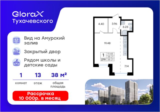 Продается квартира-студия на 19-м этаже в жилом комплексе GloraX Тухачевского — современном проекте нового формата в престижном районе Владивостока. Общая площадь лота составляет 27,06 кв. м, из которых 12,09 кв. м отведено под жилую и 5,13 кв. м под кухонную зону. Номер квартиры - 179. Преимущества квартиры: студия; высокий этаж. Преимущества проекта: • Панорамный вид на Амурский залив и зелёные сопки • Удачное расположение и транспортная доступность: Первореченский район, 20 минут до центра города • Закрытая охраняемая территория с доступом только для жителей • Эксклюзивное благоустройство: продуманное зонирование, игровые и спортивные площадки, арт-инсталляция, Тайный сад • Безбарьерная среда, видеонаблюдений, Wi-Fi на территории • Премиальный дизайн входных групп реcепшн и лаунж-зоной • Лапомойки, колясочные и туалеты на первом этаже • Подземный паркинг на 449 машиномест с доступом на лифте с жилых этажей • Индивидуальные кладовые на цокольном этаже от 2 до 10 м2 GloraX Тухачевского — это городское пространство нового формата, которое позволяет современным горожанам находить все необходимые атрибуты комфортной жизни внутри своего жилого комплекса. Весь комплекс спроектирован так, чтобы жить здесь было удобно и безопасно: светлые лаунж-зоны и ресепшн на входах в жилые корпуса, эксклюзивный дизайн мест общего пользования и придомовой территории, круглосуточная охрана, видеонаблюдение и даже детский сад в одном из корпусов все, что необходимо современному городскому жителю. GloraX Тухачевского находится в одном из самых престижных районов города с хорошей, давно сформировавшейся инфраструктурой и отличной транспортной доступностью. Отсюда легко добраться до центра города, других районов и даже пригорода как на собственном транспорте, так и на общественном. Квартал имеет прямой выезд на ул. Тухачевского, а рядом с комплексом расположена автобусная остановка на несколько маршрутов. Проект состоит из 3 монолитных корпусов, объединенных единым стилобатом. В комплексе предусмотрены: подземный паркинг с лифтом на жилые этажи, кладовые для хранения, благоустроенный двор без машин, детские и спортивные площадки, зоны для отдыха и прогулок. Эксклюзивный проект благоустройства территории разработан одной из лучших студий ландшафтного дизайна DEREVOPARK с фокусом на комфорт и удобство для всех жителей комплекса. Вся необходимая инфраструктура — магазины, школы, детские сады, остановки общественного транспорта — находится рядом. Узнайте подробности и подберите свою квартиру в GloraX Тухачевского — в отделе продаж уже сегодня. Цена указана при 100% оплате или стандартной ипотеке. Узнайте подробности в Отделе продаж.
