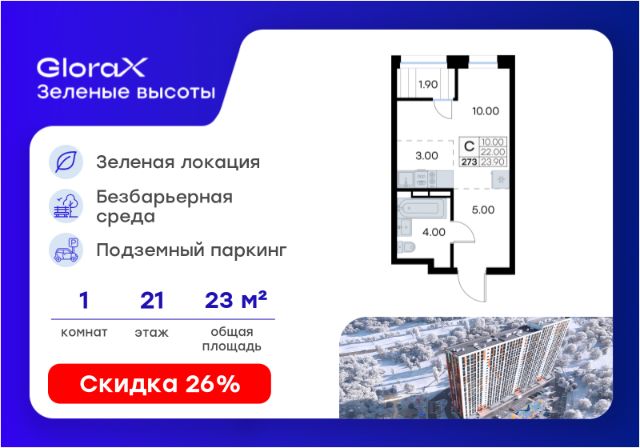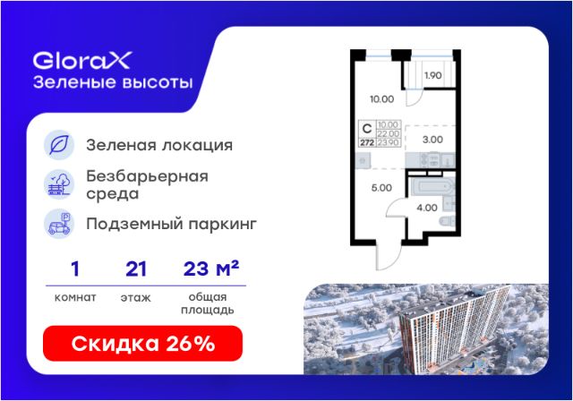Продается квартира-студия на 25-м этаже в жилом квартале GloraX Зелёные высоты — проекте в тихой зелёной локации. Общая площадь квартиры 23,90 кв. м, из которых 10,00 кв. м включая 10,00 кв. м жилого пространства и 3,00 кв. м кухни. Номер квартиры - 328. Преимущества квартиры: зонируемая студия; лоджия. Преимущества проекта: • Идеальное сочетание городской и загородной жизни • Сдаем в 2026 году • Уютный зелёный район с развитой инфраструктурой • Великолепные виды на Вечнозеленый сквер и лесопарк на 150 Га • Видеонаблюдение, IP-домофон, Wi-Fi на территории, • Дизайнерские входные группы • Безбарьерная среда, колясочные, туалеты на 1 этаже, лапомойки • Эксклюзивное благоустройство территории • Подземный паркинг на 235 машино-мест с лифтом на жилые этажи • Индивидуальные кладовые от 3 до 7 кв. м • Черновая отделка для реализации любых дизайнерских идей GloraX Зелёные высоты — современный жилой проект, сочетающий преимущества городской и пригородной жизни. Комплекс тщательно продуман для максимального удобства и обеспечения безопасности жителей. Квартал расположен в зеленом, живописном и активно развивающемся районе Зеленый Угол, вдали от серой массовой застройки. Жители GloraX Зелёные высоты смогут насладждаться прогулками в Вечнозелёном сквере или лесопарке. В непосредственной близости находятся остановки общественного транспорта и автомобильный подъезд со стороны Нейбута. Скоро также появится выездом на трассу Де-Фриз-Седанка, что обеспечит быстрый доступ в любую часть города и пригород. Проект включает 2 корпуса, каждый из которых спроектирован с акцентом на комфорт, безопасность и современный образ жизни. В комплексе предусмотрен подземный паркинг на 235 машиномест с доступом прямо с жилых этажей. Паркинг оборудован современными системами видеонаблюдения, контроля въезда-выезда и пожаротушения. Цокольный этаж здания отведен под индивидуальные кладовые площадью от 3 до 7 квадратных метров, которые можно использовать для хранения сезонных вещей. Доступ к кладовым - на лифте с жилых этажей. Территория жилого квартала благоустроена и включает игровые зоны и спортивные площадки для детей различных возрастных групп, уютные зоны отдыха со скамейками и универсальную воркаут-площадку для активного досуга. В шаговой доступности располагаются все необходимые объекты социальной инфраструктуры. Узнайте больше в отделе продаж — выберите свою квартиру в GloraX Зелёные высоты уже сегодня!