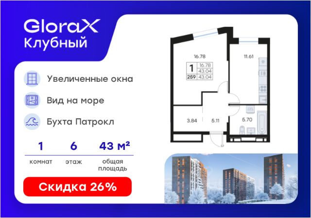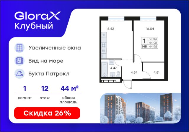 Продается 1-комн. квартира на 3-м этаже в квартале GloraX Клубный. GloraX Клубный - уникальный видовой проект с выделяющейся архитектурой в развитом районе Владивостока. Общая площадь лота составляет 38,26 кв. м, из которых 14,36 кв. м отведено под жилую и 10,90 кв. м под кухонную зону. Номер квартиры - 245. Преимущества квартиры: однокомнатная квартира; гардеробная. Преимущества проекта: • Квартиры с панорамными видами на бухту Патрокл, маяк Басаргина и остров Русский • Планировочные решения под любой жизненный сценарий от 23 до 67 м² • Гардеробные комнаты, увеличенные панорамные окна, просторные кухни-гостиные • Эксклюзивное благоустройство: продуманное зонирование, игровые и спортивные площадки, площадка для стритбола, амфитеатр • Премиальный дизайн входных групп с лаунж-зоной • Безбарьерная среда, закрытая территория, видеонаблюдение • Лапомойки, колясочные и туалеты на первом этаже • Двухуровневый подземный паркинг на 350 машино-мест с лифтом на жилые этажи • Келлеры на цокольном этаже для хранения сезонных вещей с доступом на лифте • Современный ландшафтный дизайн комплекса от DEREVOPARK GloraX Клубный заповедник в черте мегаполиса. Комплекс тщательно продуман для максимального удобства и обеспечения безопасности его жителей. Квартал расположен в одном из самых современных развивающихся районов города: совсем рядом раскинулась живописная бухта Патрокл, где можно прогуляться по облагороженной пешеходной набережной, заглянуть на пляж или в школу серфинга. Комплекс имеет прекрасную транспортную доступность: рядом проходит объездная трасса СеданкаПатрокл, а до центар можно доехать всего за 15 минут. Проект включает 3 монолитных корпуса, каждый из которых спроектирован с акцентом на комфорт, безопасность и современный образ жизни рядом с уникальной природой. Общий двор создает приватную территорию для житей комплекса. В комплексе предусмотрен двухуровневый подземный паркинг на 350 машино-мест с доступом прямо с жилых этажей. Паркинг оборудован современными системами видеонаблюдения, контроля въезда-выезда и пожаротушения. На цокольном этаже размещаются келлеры для хранения сезонных и габаритных вещей. Доступ к кладовым на лифте с жилых этажей. Современный ландшафтный дизайн жилого комплекса GloraX Клубный создан ведущей российской студией DEREVOPARK. Во дворе для детей всех возрастов предусмотрены различные игровые площадки с лазалками, батутами, качелями и песочницей. В центре расположен специальный "зеленый остров", где взрослые могут отдохнуть на качелях и гамаках в тени больших деревьев. Для любителей спорта предусмотрены две специальные спортивные площадки для настольного тенниса и стритбола — для зрителей тоже найдется место! А еще на территории комплекса будет дорожка для роллеров и любителей покататься на велосипеде, самокате или скейте. В шаговой доступности располагаются все необходимые объекты социальной и коммерческой инфраструктуры. Цена указана при 100%
