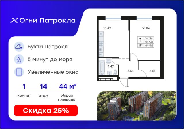 Продается 1-комн. квартира на 2-м этаже в проекте Огни Патрокла от GloraX. Огни Патрокла - уникальный видовой проект с выделяющейся архитектурой в развитом районе Владивостока. Общая площадь лота составляет 38,26 кв. м, из которых 14,36 кв. м отведено под жилую и 10,90 кв. м под кухонную зону. Номер квартиры - 232. Преимущества квартиры: однокомнатная квартира; гардеробная. Преимущества проекта: • Квартиры с панорамными видами на бухту Патрокл, маяк Басаргина и остров Русский • Планировочные решения под любой жизненный сценарий от 23 до 67 м² • Гардеробные комнаты, увеличенные панорамные окна, просторные кухни-гостиные • Эксклюзивное благоустройство: продуманное зонирование, игровые и спортивные площадки, площадка для стритбола, амфитеатр • Премиальный дизайн входных групп с лаунж-зоной • Безбарьерная среда, закрытая территория, видеонаблюдение • Лапомойки, колясочные и туалеты на первом этаже • Двухуровневый подземный паркинг на 350 машино-мест с лифтом на жилые этажи • Келлеры на цокольном этаже для хранения сезонных вещей с доступом на лифте • Современный ландшафтный дизайн комплекса от DEREVOPARK Проект Огни Патрокла заповедник в черте мегаполиса. Комплекс тщательно продуман для максимального удобства и обеспечения безопасности его жителей. Квартал расположен в одном из самых современных развивающихся районов города: совсем рядом раскинулась живописная бухта Патрокл, где можно прогуляться по облагороженной пешеходной набережной, заглянуть на пляж или в школу серфинга. Комплекс имеет прекрасную транспортную доступность: рядом проходит объездная трасса СеданкаПатрокл, а до центра можно доехать всего за 15 минут. Проект включает 3 монолитных корпуса, каждый из которых спроектирован с акцентом на комфорт, безопасность и современный образ жизни рядом с уникальной природой. Общий двор создает приватную территорию для жителей комплекса. В комплексе предусмотрен двухуровневый подземный паркинг на 350 машино-мест с доступом прямо с жилых этажей. Паркинг оборудован современными системами видеонаблюдения, контроля въезда-выезда и пожаротушения. На цокольном этаже размещаются келлеры для хранения сезонных и габаритных вещей. Доступ к кладовым на лифте с жилых этажей. Современный ландшафтный дизайн жилого комплекса Огни Патрокла создан ведущей российской студией DEREVOPARK. Во дворе для детей всех возрастов предусмотрены различные игровые площадки с лазалками, батутами, качелями и песочницей. В центре расположен специальный "зеленый остров", где взрослые могут отдохнуть на качелях и гамаках в тени больших деревьев. Для любителей спорта предусмотрены две специальные спортивные площадки для настольного тенниса и стритбола — для зрителей тоже найдется место! А еще на территории комплекса будет дорожка для роллеров и любителей покататься на велосипеде, самокате или скейте. В шаговой доступности располагаются все необходимые объекты социальной и коммерческой инфраструктуры. Действу