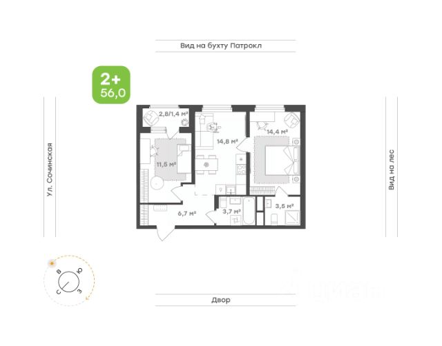 Квартира для небольшой и счастливой семьи Кухня-гостиная объединяет в себе удобство и эстетику. Здесь легко готовить, собираться за общим столом и проводить вечера в тёплой обстановке. Большая площадь даёт возможность зонировать пространство и создать уютный уголок для отдыха Спальня наполнена естественным светом и уединённостью. Выход на лоджию создаёт дополнительное пространство для отдыха и позволяет наслаждаться лучами солнца Детская — уютная и многофункциональная. Достаточно места и для игр, и для спокойного обучения, а окно на школу делает комнату светлой и комфортной в любое время дня Два санузла избавят от утренней спешки. Ванная комната станет личной зоной релакса, а дополнительный санузел добавит удобства в повседневной жизни Прихожая продумана до мелочей. Место для хранения организовано так, чтобы вещи не загромождали пространство, а порядок поддерживался легко и естественно