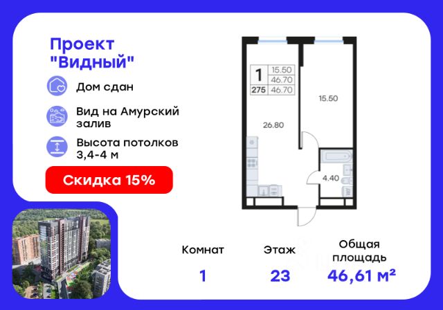 Продается 1-комн. квартира на 17-м этаже в жилом комплексе Видный — современном проекте комфорт-класса в развитом районе Владивостока. Общая площадь лота составляет 46,61 кв. м, из которых 15,58 кв. м отведено под жилую и 21,32 кв. м под кухонную зону. Номер квартиры - 203. Преимущества проекта: • Дом сдан — ключи можно получить в день оплаты • Современная архитектура и 24 этажа монолитного комфорта • Спокойный район с готовой инфраструктурой и удобной транспортной доступностью • Подземный паркинг на 284 машиноместа с видеонаблюдением и доступом на лифте с жилых этажей • Индивидуальные келлеры от 2,3 до 7,9 м² на подземном уровне • Просторные входные группы с дизайнерской отделкой и помещениями для хранения колясок • Двор без машин: благоустроенная территория, детские и спортивные площадки, зоны отдыха • Коммерческие помещения на первых этажах — магазины, кофейни, пекарни прямо у дома • Авторский ландшафтный проект с освещением, озеленением и зонированием Проект Видный — это городское пространство нового формата, где каждый элемент продуман для комфорта современных жителей. Входы на уровне земли, бесшумные скоростные лифты, дизайнерские холлы, келлеры и колясочные — всё для удобной и современной жизни. Комплекс расположен на улице Карбышева — в тихом, но развитом районе Владивостока. В шаговой доступности — детские сады, школы, магазины, кафе, аптеки и остановки общественного транспорта. Удобный выезд на городские магистрали позволяет быстро добраться до центра, автовокзала (5 км), парка Покровского (8 км) и международного аэропорта (45 км). Архитектура проекта сочетает современные решения и высокое качество материалов. Единственный корпус на 24 этажа выполнен по монолитной технологии с акцентом на эстетику и долговечность фасадов. Пространство организовано с учётом потребностей разных жителей — от молодых семей до деловых людей и пенсионеров. Проект благоустройства разработан с упором на безопасность и комфорт: зоны отдыха, спортивные и игровые площадки, ландшафтный дизайн и вечерняя подсветка создают атмосферу уюта и приватности. Узнайте подробности и подберите свою квартиру в GloraX Видный — в отделе продаж уже сегодня. Цена указана при 100% оплате или стандартной ипотеке. Узнайте подробности в Отделе продаж.