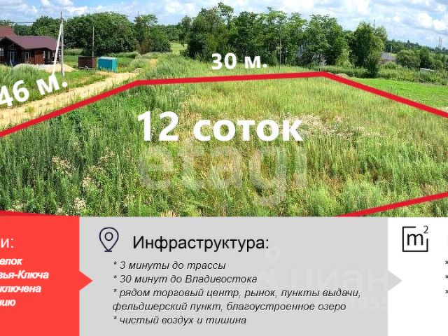 Компания "Этажи - Владивосток" продает земельный участок 10 соток, находящийся на организованной территории формата мини-поселка "Park House" в п. Соловей Ключ. Вы хотите приобрести эту недвижимость, но у вас не продана своя? Бронируем на период продажи Вашей. Преимущества земельного участка: + Участок 10 соток; + Выровненный, поднятый и ровный; + Участок непотопляемый; + Круглогодичный подъезд, зимой чистят дороги; + Есть возможность строительства других объектов; + На участке уже возведен добротный фундамент, толщиной 40 см + На территории установлен шлагбаум, территория охраняется; + Сети электропередач (15 кВт) отдельно установлены организатором поселка и проведены отдельно от поставщика п. Соловей-Ключ. Преимущества района: + Отсутствует шум от дороги; + 30-40 мин до города; + Проект организатора поселка говорит о благоустроенной территории, с озерами, парком отдыха, магазина на территории, и даже детским садиком на территории. Проект доступен в соц сетях, интернете. Звоните! Показ осуществляется по предварительной записи. Код пользователя: 168816 Номер в базе: 9030493