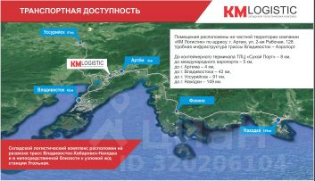 Склад расположен на территории ООО КМ Логистик по адресу: г. Артем, ул. 2-я Рабочая 162, позволяет максимально эффективно использовать инфраструктуру автомобильной дороги международного транспортного коридора Приморье-1.