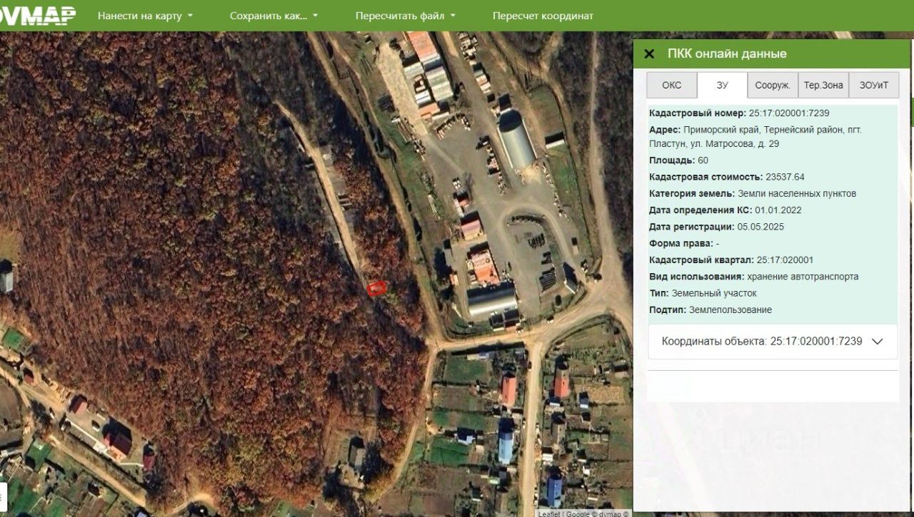 Земельный участок из земель населенных пунктов с местоположением: Местоположение установлено относительно ориентира, расположенного за пределами участка. Ориентир жилой дом. Участок находится в 106 м от ориентира по направлению на северо-запад. Почтовый адрес ориентира: Приморский край, Тернейский район, пгт. Пластун, ул. Матросова, д. 29., кад. 25:17:020001:7239, площадь 60 кв. м., вид разрешенного использования: хранение автотранспорта.