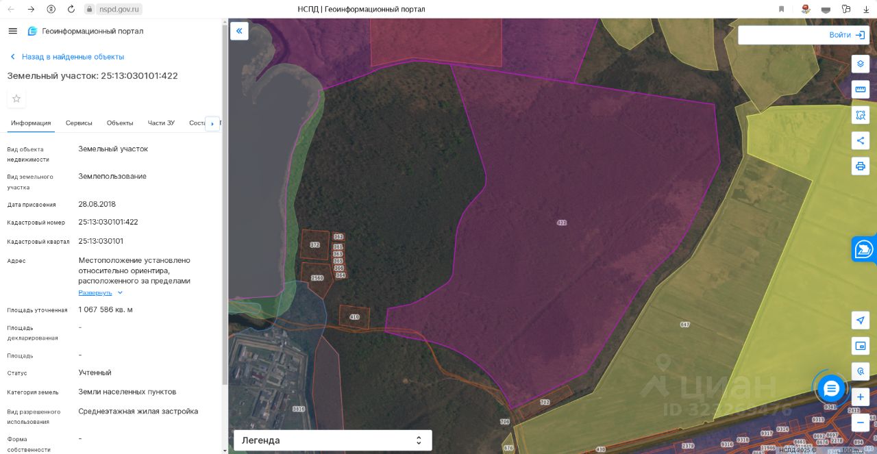 Земельный участок площадью 1 067 586 кв.м., кадастровый номер 25:13:030101:422. Местоположение: установлено относительно ориентира, расположенного за пределами участка. Ориентир магазин продуктово — промышленный. Участок находится примерно в 1157 метрах по направлению на юго-запад от ориентира. Почтовый адрес ориентира: Приморский край, Партизанский район, пос. Волчанец, ул. Комсомольская, д.16. Категория земель: земли населенных пунктов. Вид разрешенного использования: среднеэтажная жилая застройка.