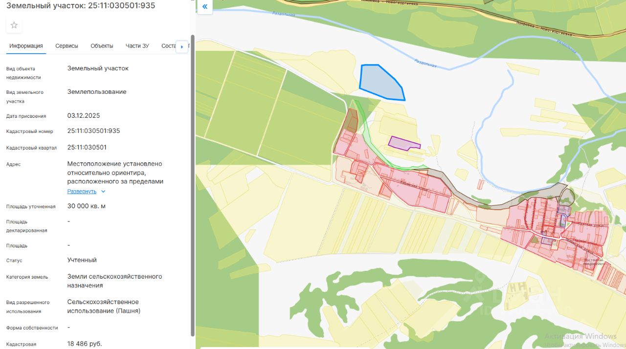 Земельный участок с кадастровым номером 25:11:030501:935 площадь 30000 по адресу Приморский край, Октябрьский муниципальный округ, с. Синельниково-2, ул. Хуторская, д. 2а