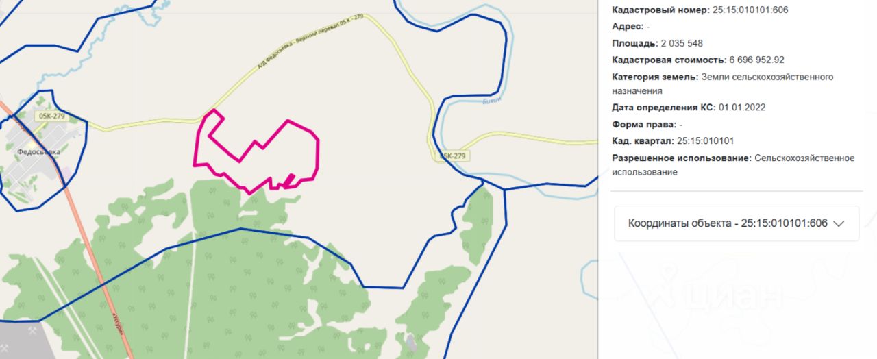 Земельный участок с кадастровым номером 25:15:010101:606, общей площадью 2035548+/-12484 кв.м., из категории земель земли сельскохозяйственного назначения. Виды разрешенного использования: Сельскохозяйственное использование. Местоположение установлено относительно ориентира, расположенного за пределами участка. Ориентир здание администрации. Участок находится примерно в 9,7 км от ориентира по направлению на север. Почтовый адрес ориентира: край Приморский, Пожарский район, пгт. Лучегорск, Общественный центр, 1