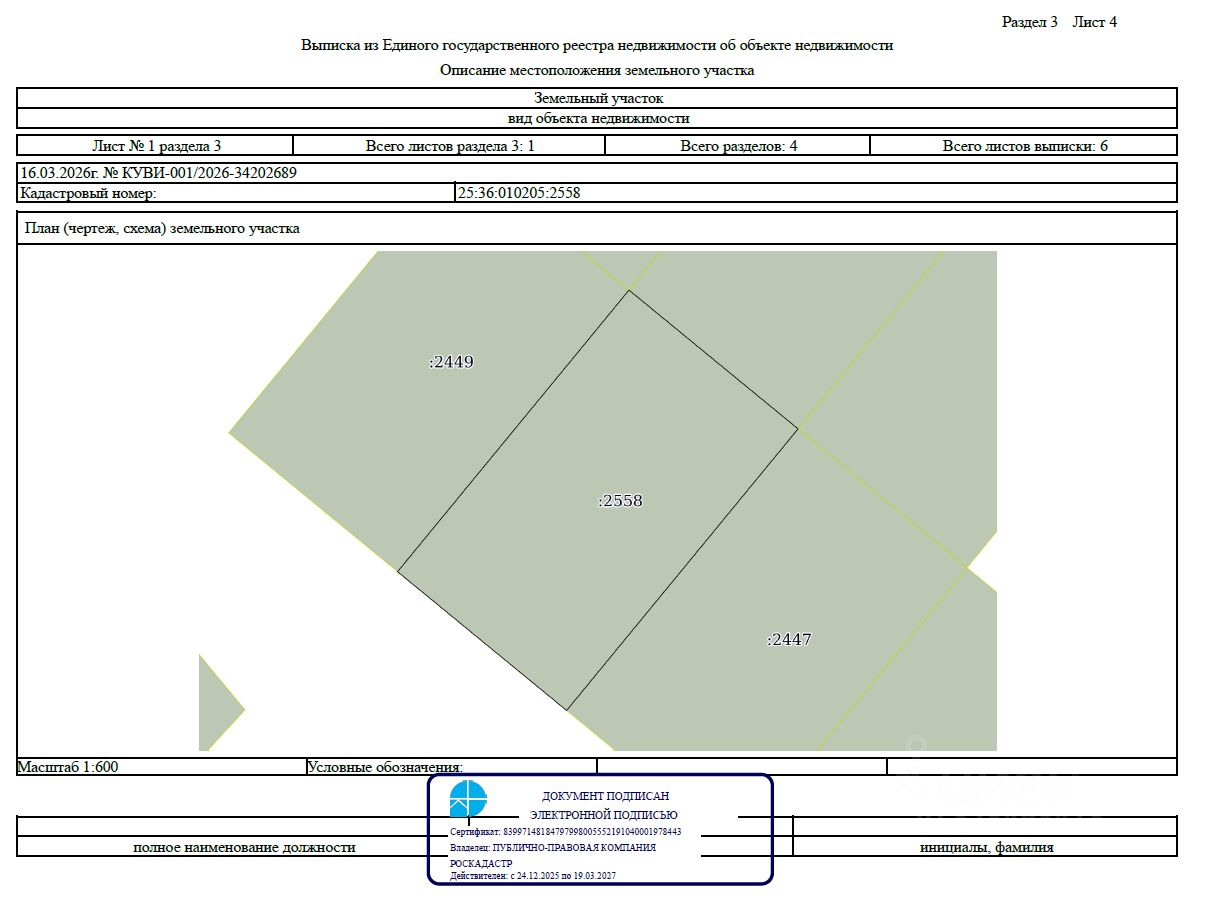 площадь: общей площадью 1500 кв. м. кадастровый номер земельного участка: 25:36:010205:2558. права на земельный участок: права на земельный участок не зарегистрированы, земельный участок находится на землях, государственная собственность на которые не разграничена. ограничение прав: вид ограничения (обременения): ограничения прав на земельный участок, предусмотренные градостроительным планом земельного участка. разрешённое использование: для индивидуального жилищного строительства. цель использования: для индивидуального жилищного строительства.
