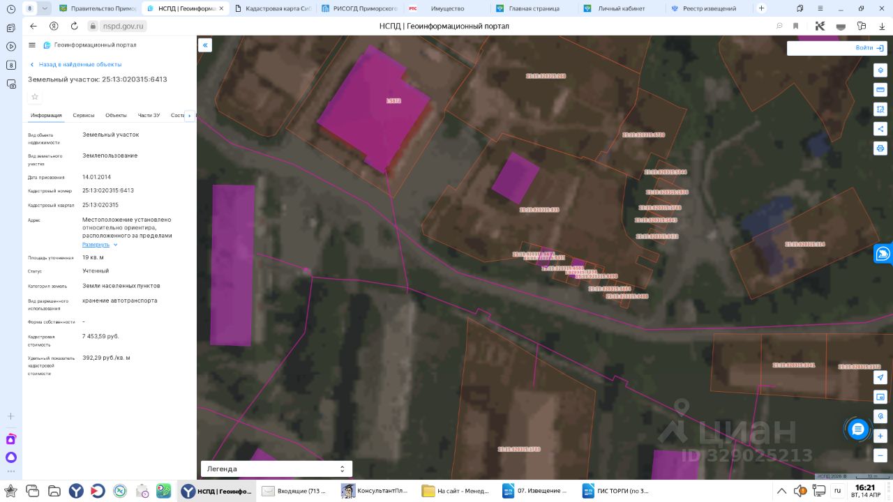 Земельный участок общей площадью 19 кв.м., кадастровый номер 25:13:020315:6413. Местоположение: установлено относительно ориентира, расположенного за пределами участка. Ориентир — дом. Участок находится примерно в 45 метрах по направлению на север от ориентира. Почтовый адрес ориентира: Приморский край, Партизанский район, с. Владимиро-Александровское, ул. Кости Рослого, д.67. Категория земель: земли населенных пунктов. Вид разрешенного использования: хранение автотранспорта.