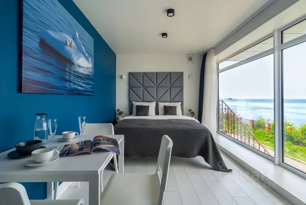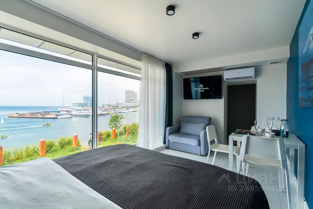 Уникальные апартаменты, расположены в самом центре города, в уединенном месте на берегу бухты Фёдорова, в 20 метрах от среза воды, из огромных окон открывается шикарный вид на бухту, наши гости могут провожать закаты, наблюдать как десятки маленьких парусных яхт проводят свои тренировки, невероятное место.