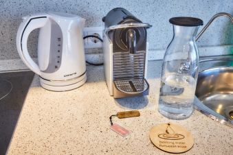 В распоряжении гостей — прачечная, со стиральной и сушильной машиной, утюгом и гладильной доской. Так же в свободном доступе чайные наборы, кофе-капсулы, фен, банные принадлежности, тапочки.