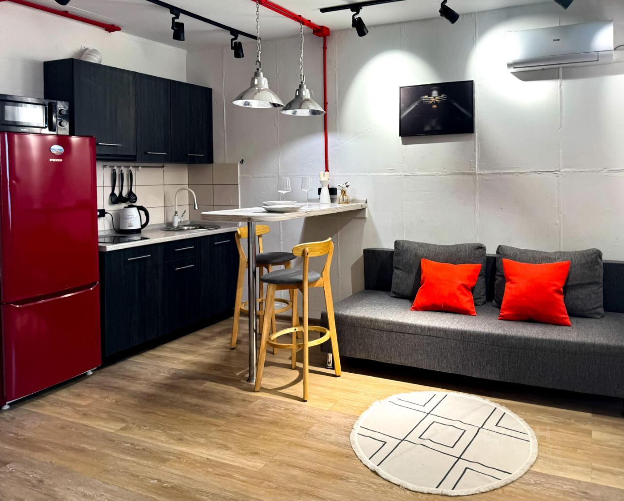 Удобства: двуспальная кровать, удобный диван, гардеробная система. По запросу дополнительное место.