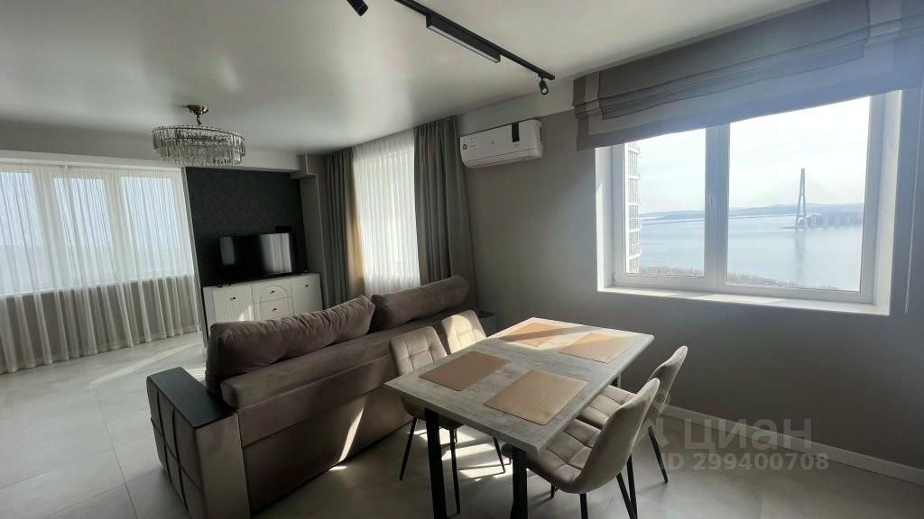 В квартире имеется необходимое для пребывания четырёх человек. Бытовая техника, мебель и предметы быта — в распоряжении гостей. Из окон открывается вид на море и мост "Русский".