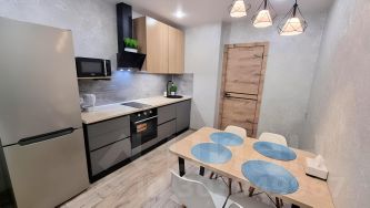 Комнаты все раздельные, в каждой комнате ТВ, кровати размером 160*200, в зале два дивана раздвижные, отдельно кухня.