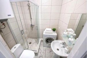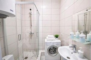 - Своя ванная комната с ванной, водонагревателем, стиральной машиной (с порошком!), феном, сушилкой.
