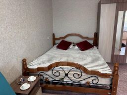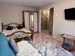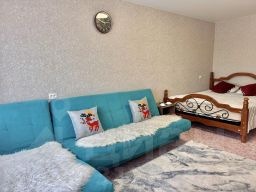 В квартире предусмотрено размещение до 5 гостей: двуспальная кровать, раздвижной диван и тахта.
