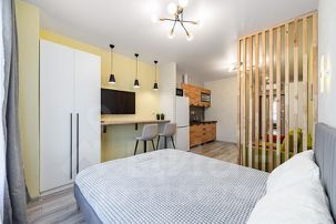 Новая мебель и техника: двуспальная кровать,двуспальный диван, стиральная машина, микроволновка, кондиционер, теплый пол.